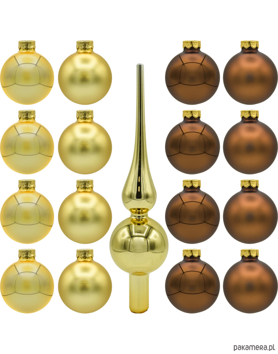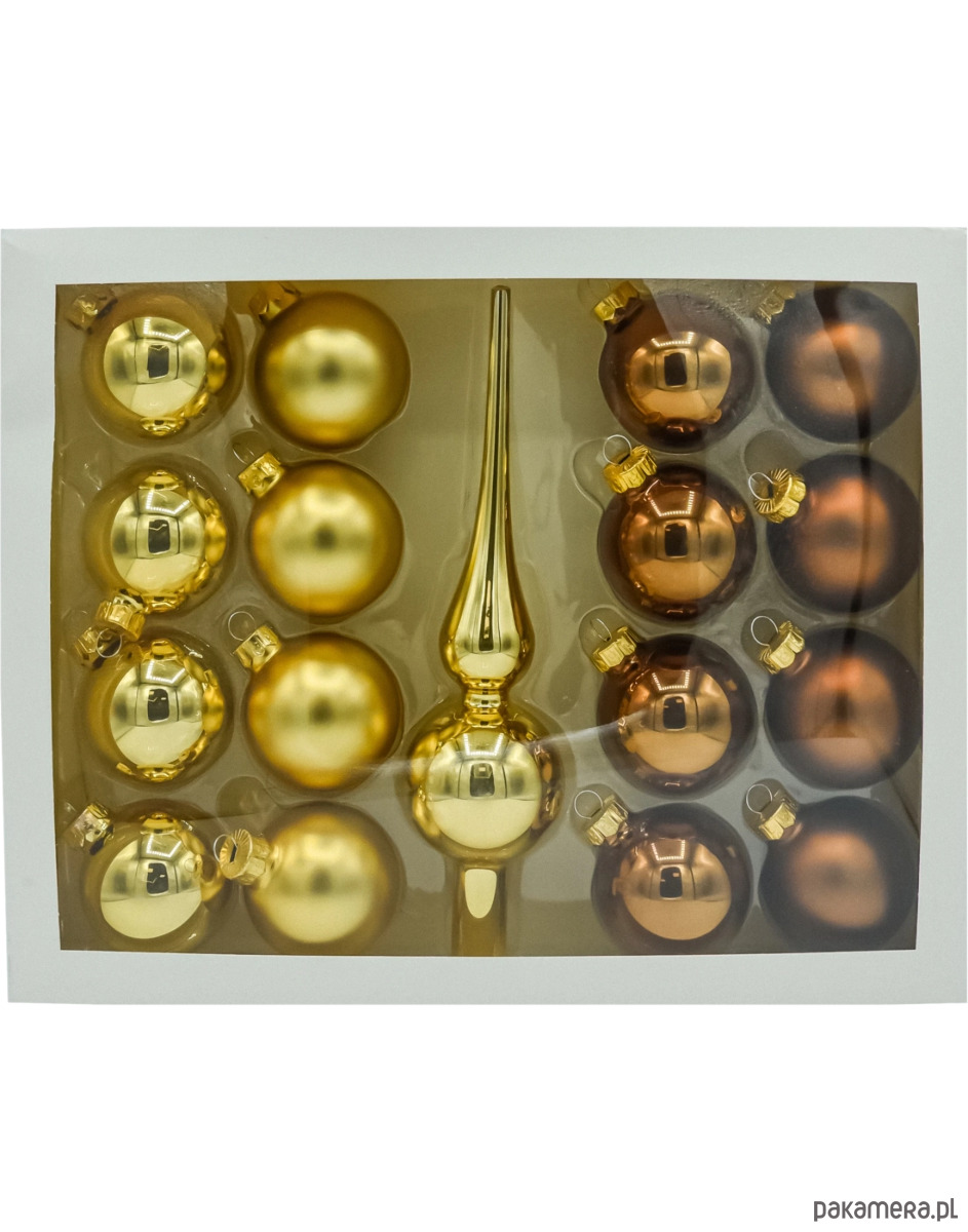 Wytworny komplet szklanych ozdób, który w kilka minut stworzy spójną, ciepłą i elegancką aranżację choinki. W pudełku znajdziesz 16 klasycznych bombek w dwóch szlachetnych kolorach – złocie i miedzi – w dwóch wykończeniach: mat i połysk, oraz złoty czub (szpic) do zwieńczenia drzewka. To gotowy zestaw bombek choinkowych dla osób, które cenią spójność kolorystyczną i „hotelowy” porządek na choince bez długiego dobierania elementów.