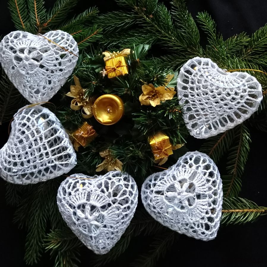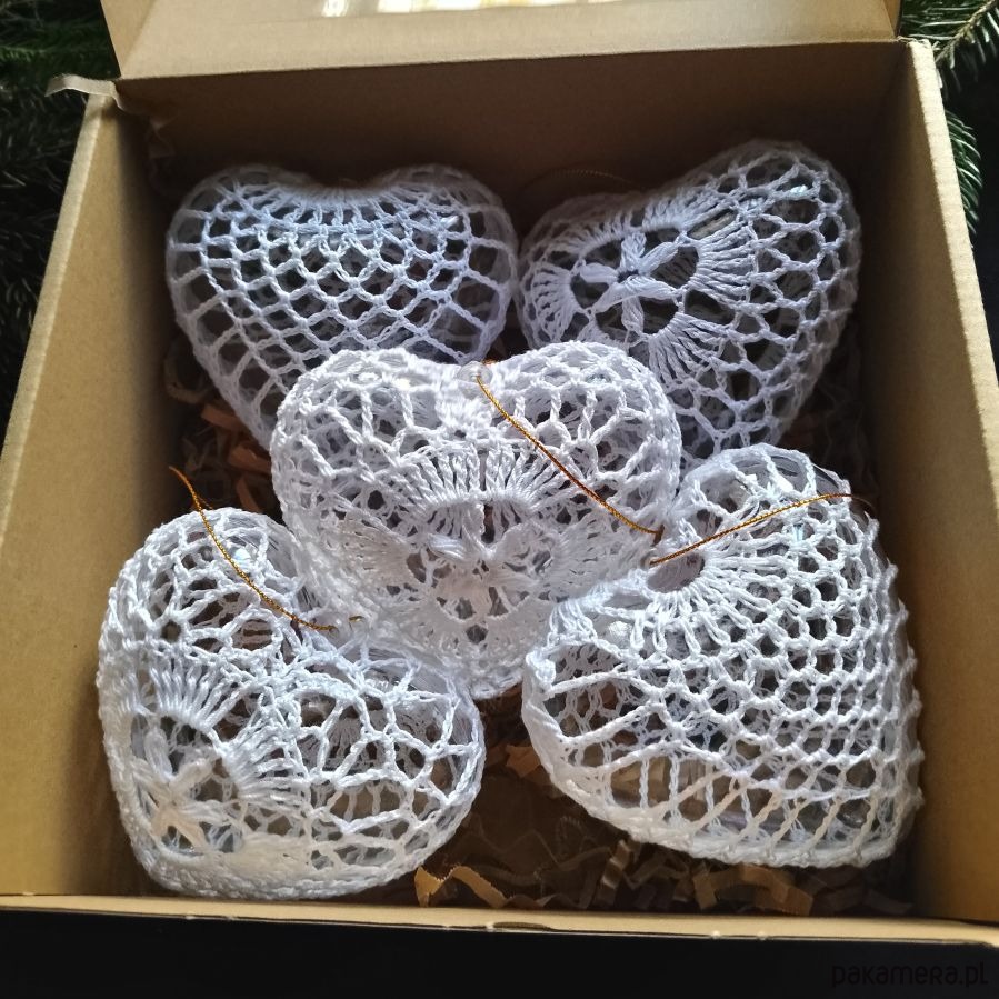 Piękne bombki szydełkowe w kształcie serca wwielkości 10 cm. Wykonane z białego bawełnianego kordonku na akrylowych wkładach, zawieszki w kolorze zotym. W zestawie5 szt. Zapakowane w kartonowym pudełku