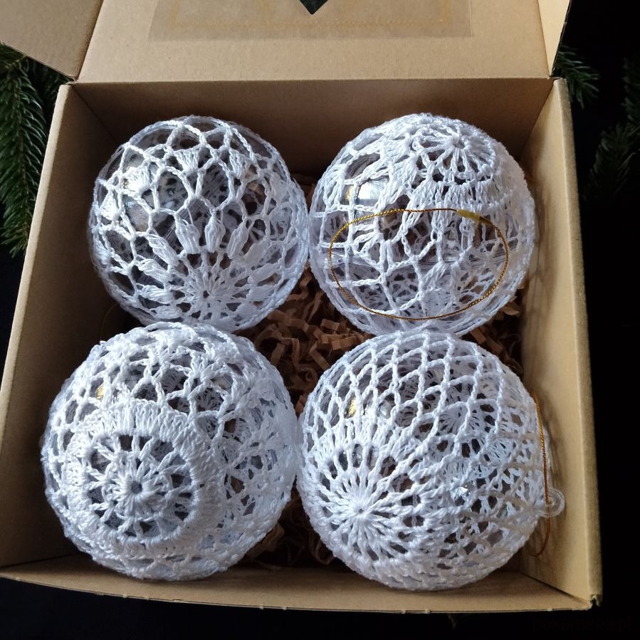 Piękne bombki szydełkowe o średnicy 10 cm wykonane z białego bawełnianego kordonku na akrylowych kulach. W zestawie 4 szt. Zawieszki w kolorze złotym, Zapakowane w pudełku z okienkiem w kształcie choinki. Wspaniała ozdoba choinki, stroika świątecznego, idealne na prezent. Są do wielokrotnego użytku, mogą służyć kilka lat.