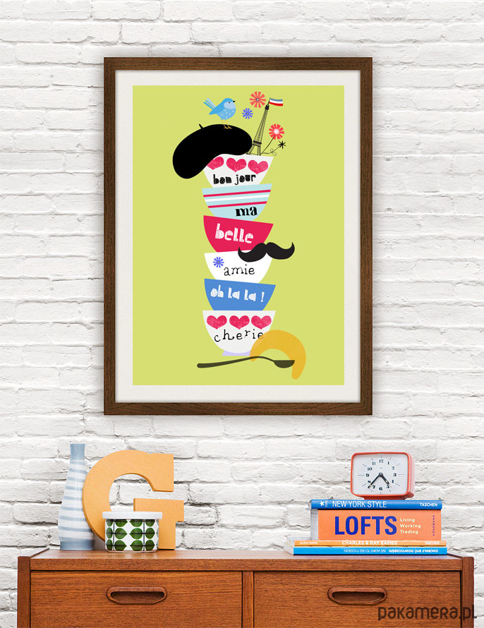 Plakat w stylu skandynawskim z autorską grafiką przedstawiającą kolekcję kolorowych kubków i miseczek z napisem "Bon jour ma belle amis, oh la la! Cherie". Oryginalna dekoracja do wymarzonej kuchni. Oryginalna dekoracja do wymarzonej kuchni. Zaprojektowany przez niemiecką artystkę Elisandrę Sevenstar.