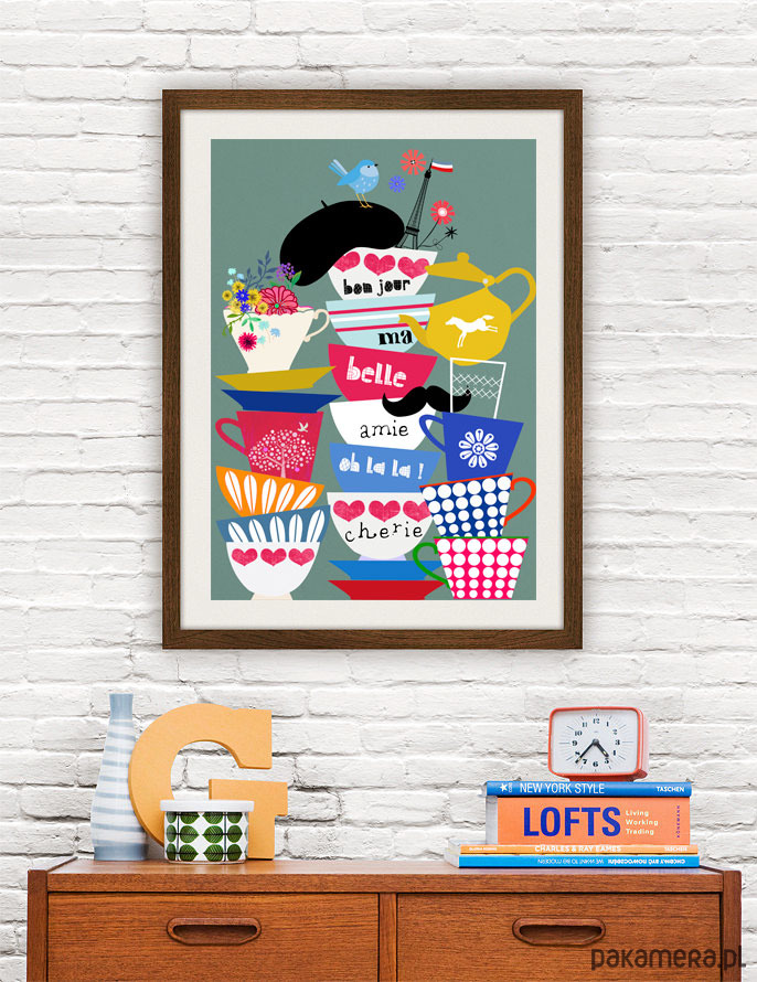 Plakat w stylu skandynawskim z autorską grafiką przedstawiającą kolekcję kolorowych kubków i miseczek z napisem "Bon jour ma belle amis, oh la la! Cherie". Oryginalna dekoracja do wymarzonej kuchni. Oryginalna dekoracja do wymarzonej kuchni. Zaprojektowany przez niemiecką artystkę Elisandrę Sevenstar.