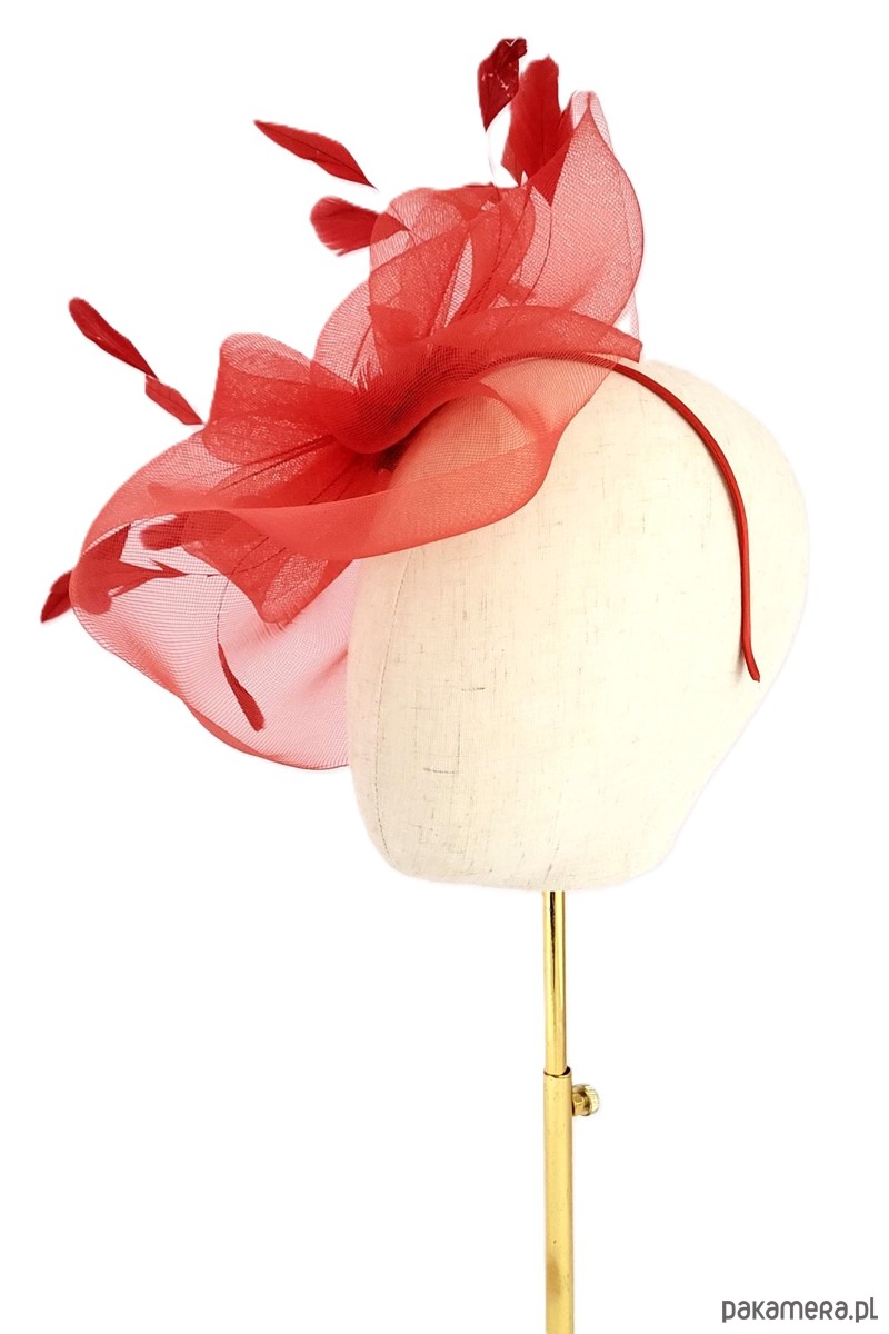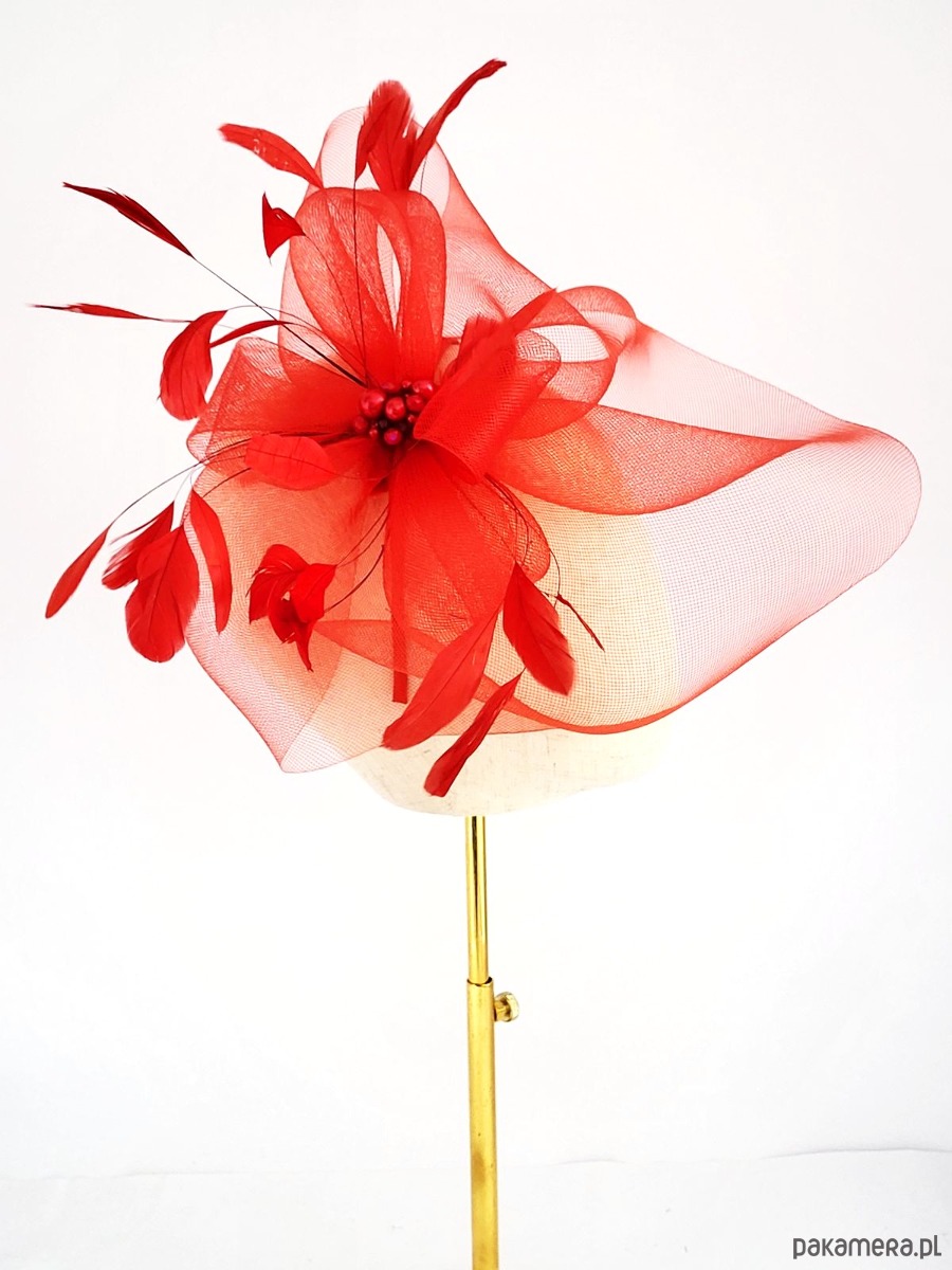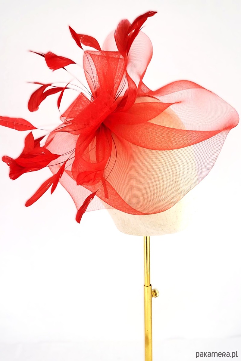 Elegancki, duży fascynator w intensywnym, czerwonym kolorze to idealny dodatek dla kobiet ceniących wyrazisty styl i klasę. Doskonały na śluby, wyścigi konne (Royal Ascot), przyjęcia koktajlowe czy inne uroczyste okazje.