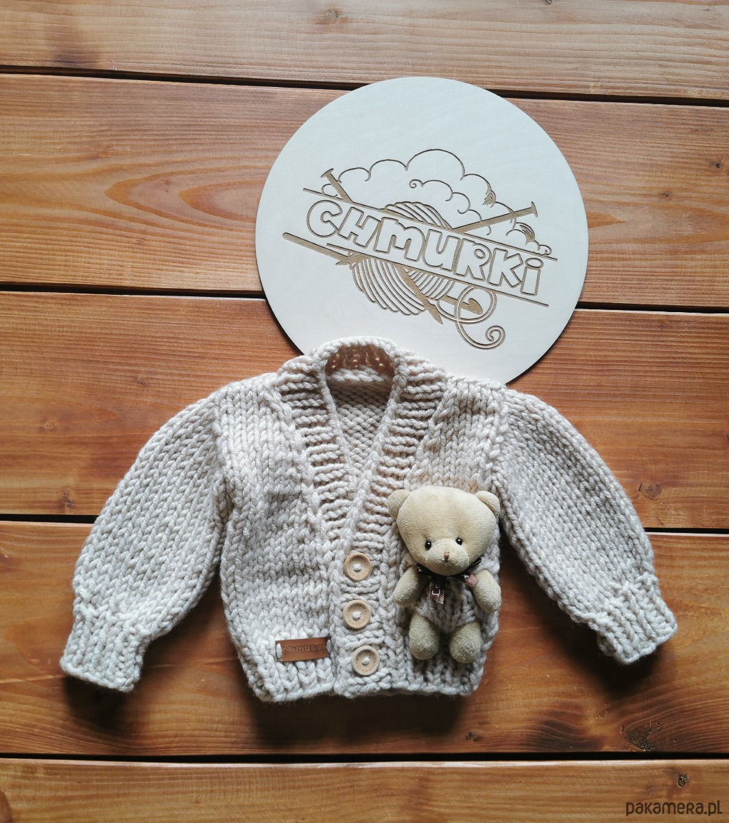 Ręcznie dziergane sweterek z misiem, zapinany na 3 guziki.