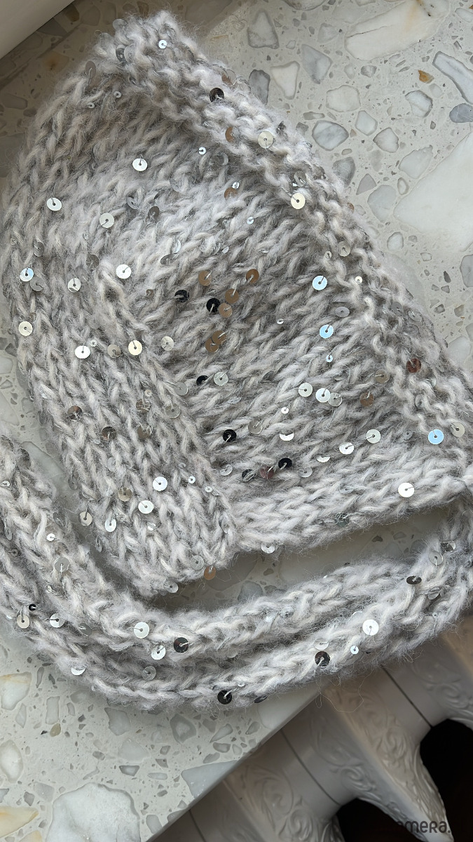 To model, który pokazuje, że klasyczna forma może funkcjonować zupełnie inaczej, jeśli poda się ją w odpowiedniej skali i fakturze. Miękkie połączenie alpaki, bawełny i merino zyskuje tu nowy rytm dzięki drobnym cekinom — nie dekoracyjnym, lecz strukturalnym. Ich obecność nie ma „zdobić”, tylko delikatnie zakłócać powierzchnię, nadając całości świetlistą głębię.