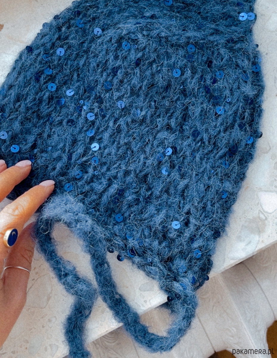 To model, który pokazuje, że klasyczna forma może funkcjonować zupełnie inaczej, jeśli poda się ją w odpowiedniej skali i fakturze. Miękka i puchata alpaka zyskuje tu nowy rytm dzięki drobnym cekinom — nie dekoracyjnym, lecz strukturalnym. Ich obecność nie ma „zdobić”, tylko delikatnie zakłócać powierzchnię, nadając całości świetlistą głębię.