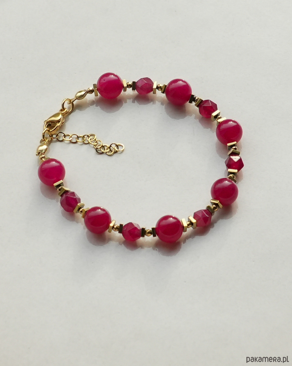 Piękna, ozdobna bransoletka z kamieni naturalnych o intensywnym kolorze, wykonana z bordowego JADEITU i złotego HEMATYTU. Zapięcie i łańcuszek to STAL SZLACHETNA w kolorze złotym.