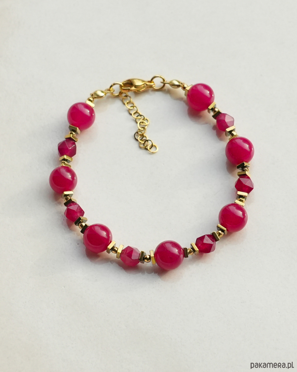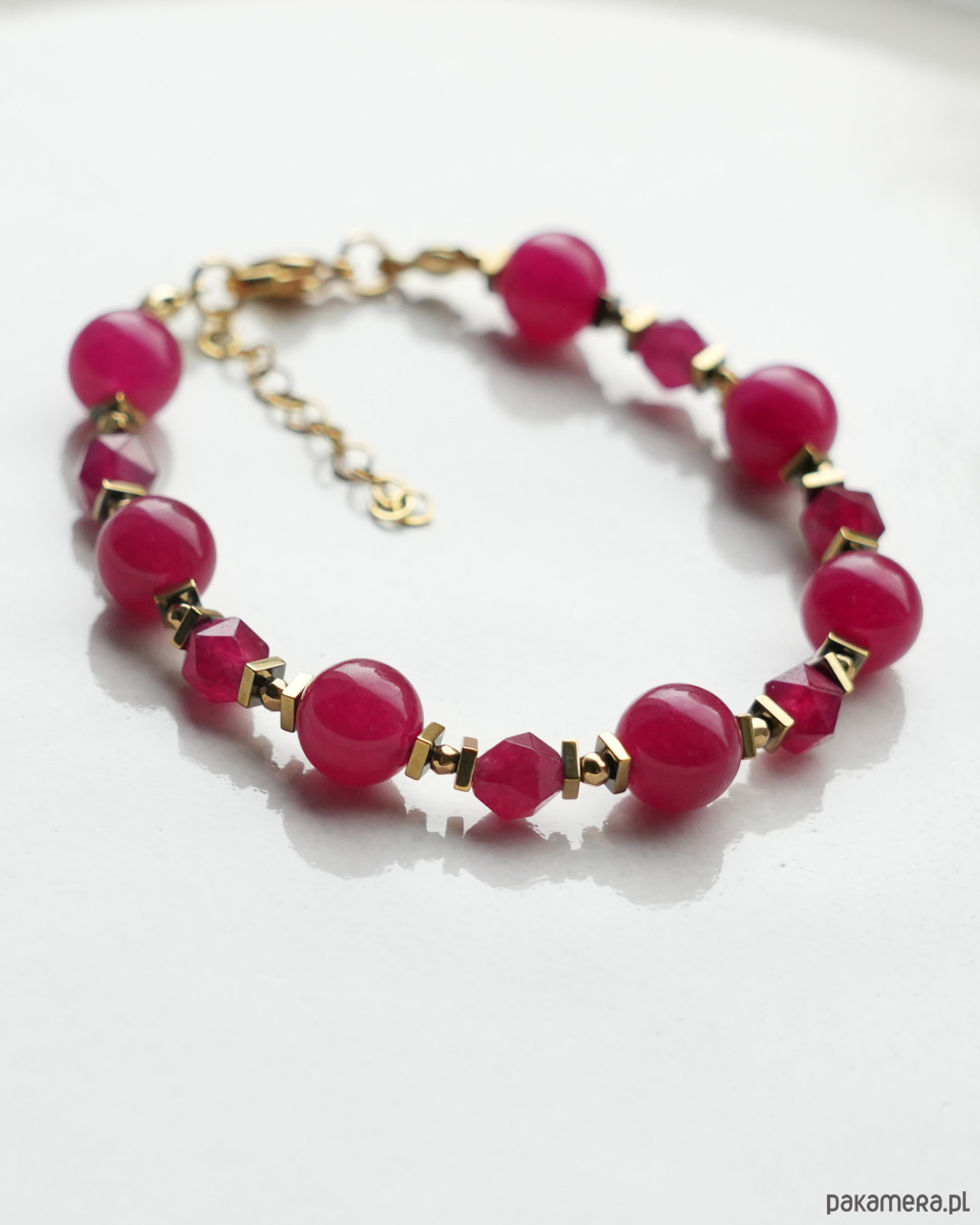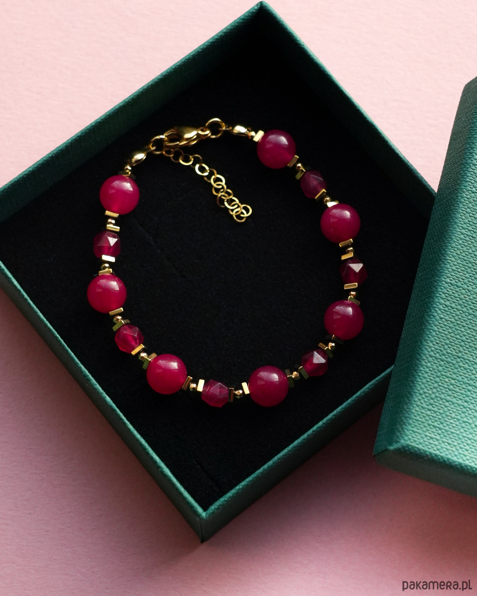 Piękna, ozdobna bransoletka z kamieni naturalnych o intensywnym kolorze, wykonana z bordowego JADEITU i złotego HEMATYTU. Zapięcie i łańcuszek to STAL SZLACHETNA w kolorze złotym.