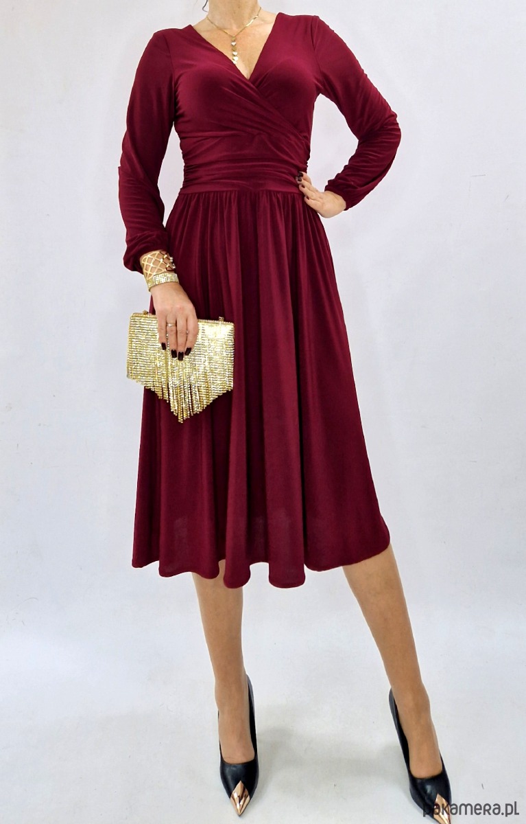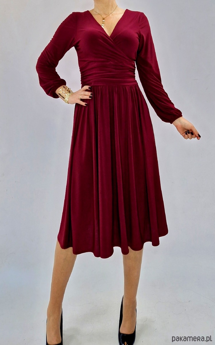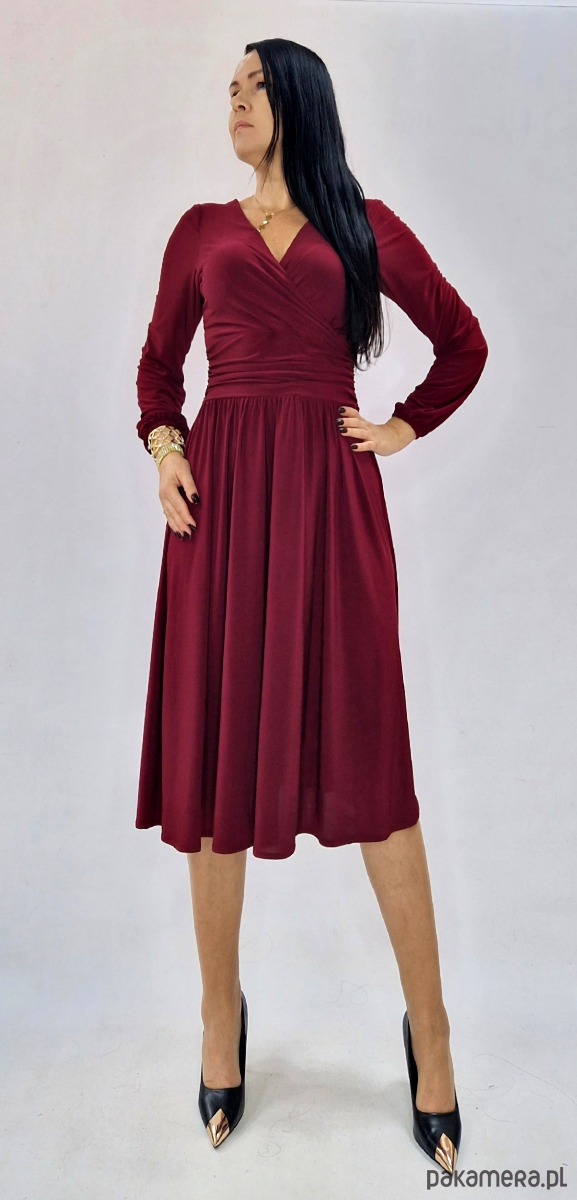Prezentujemy elegancką i kobiecą sukienkę midi w kolorze bordowym. Jej klasyczny krój, kopertowy dekolt i rozkloszowany dół sprawiają, że jest to idealna propozycja zarówno na wesele, przyjęcie rodzinne, jak i spotkanie biznesowe czy wieczorne wyjście.