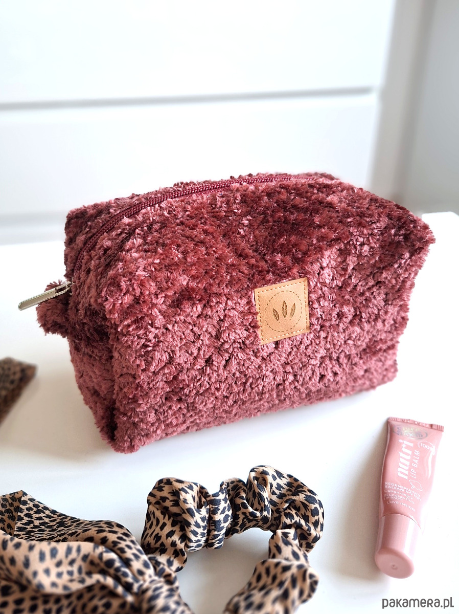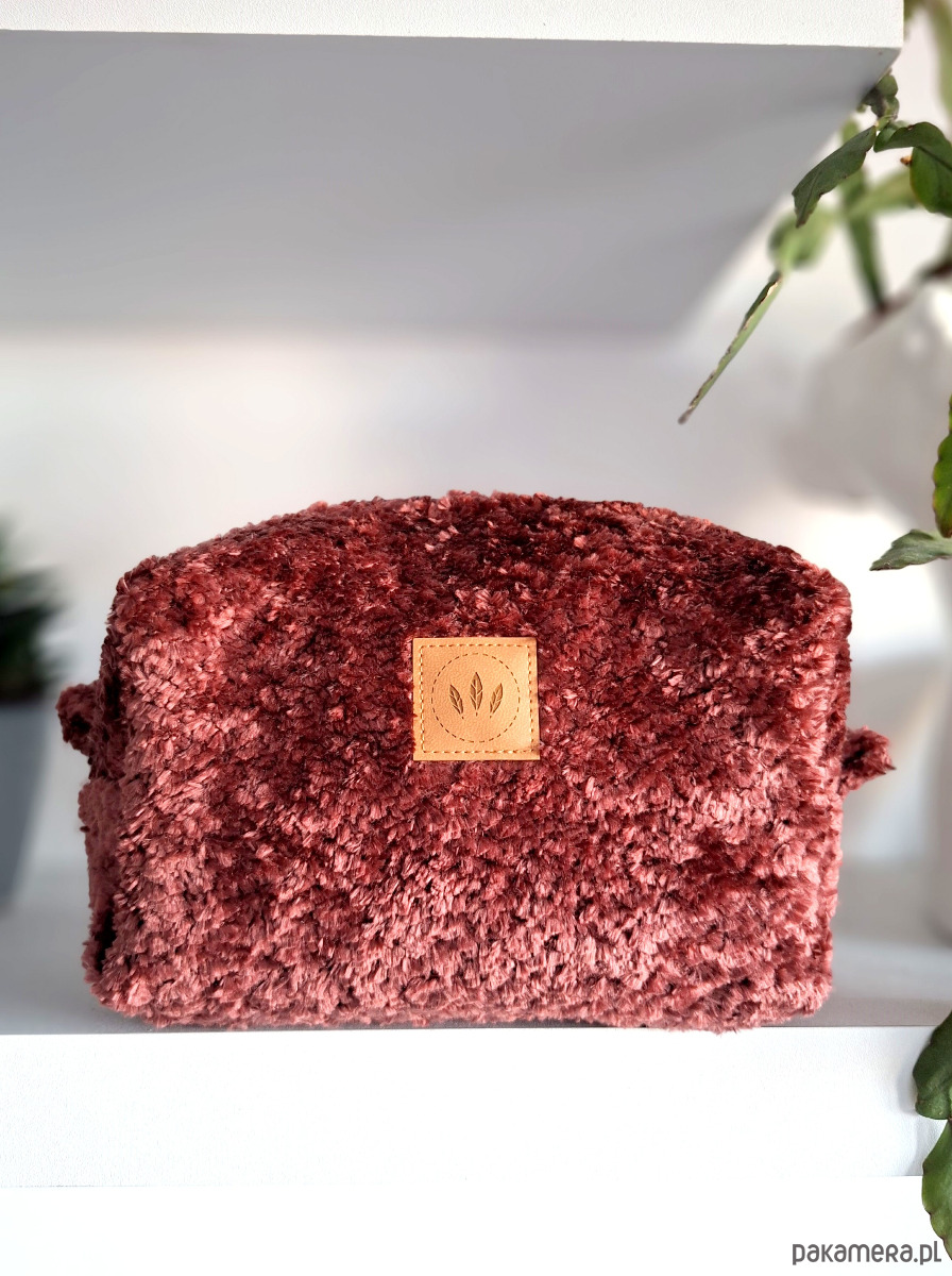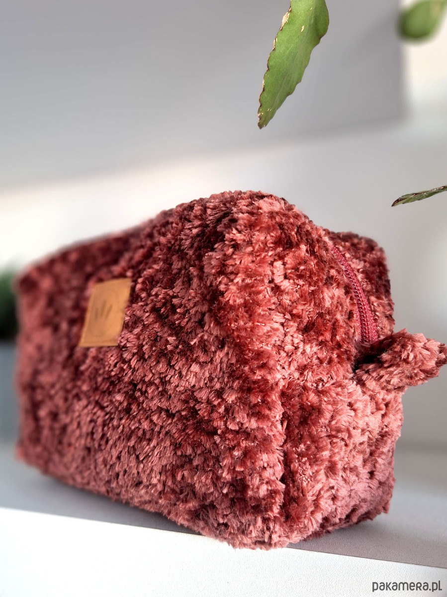 Średniej wielkości kosmetyczka z fantazyjnej tkaniny o fakturze welurowego misia.