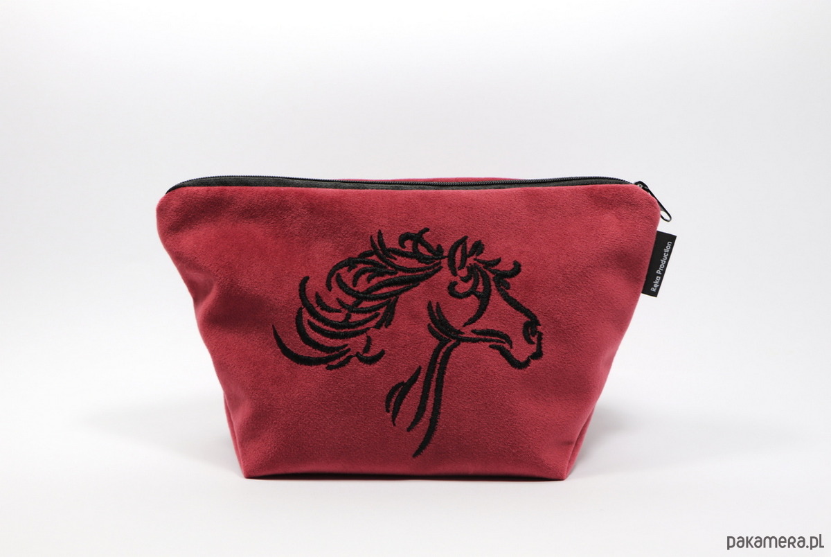 Bordowa kosmetyczka z wyszytym czarnym koniem