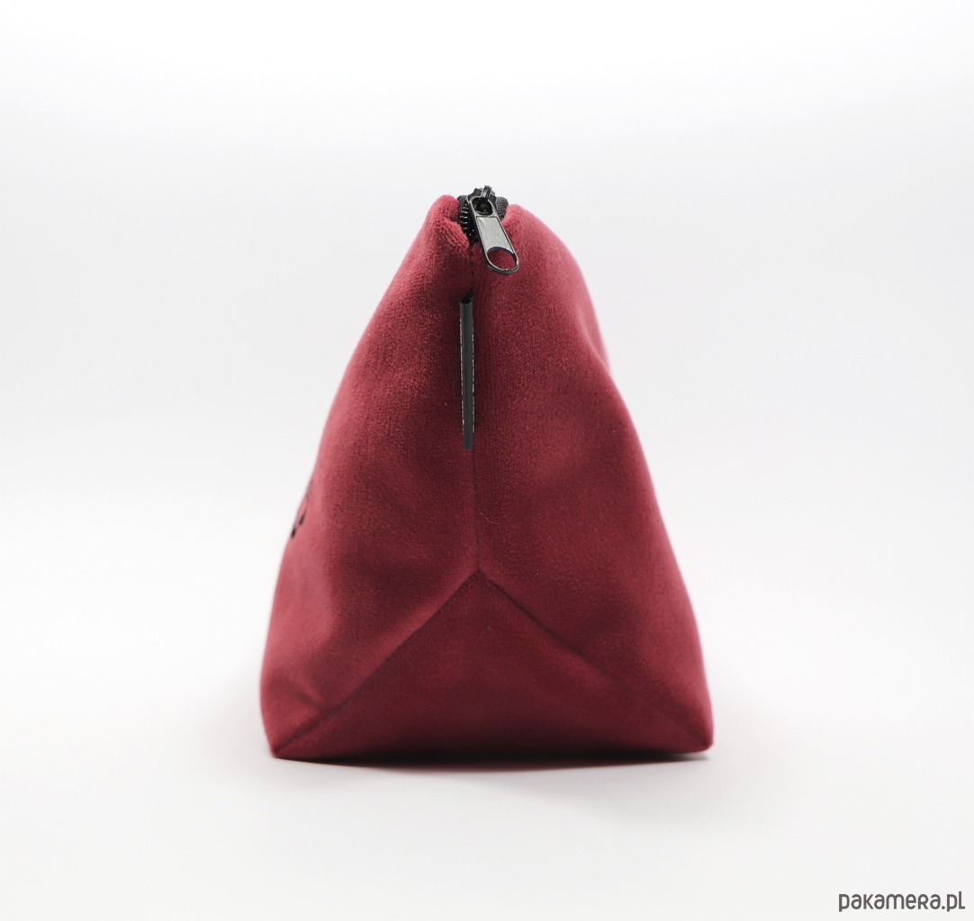 Kosmetyczka średniej wielkości. Bardzo pakowna, więc idealnie spisze się podczas podróży. Uszyta została z przemiłego w dotyku eko weluru w pięknym bordowo-tabasco kolorze. Z przodu ozdobiona została pięknym haftem w kolorze czarnym. Kosmetyczka została usztywniona w taki sposób, że nawet pusta trzyma fason. Do środka kosmetyczki została wszyta podszewka bawełniana. Kosmetyczka zapinana jest na zamek w kolorze czarnym.