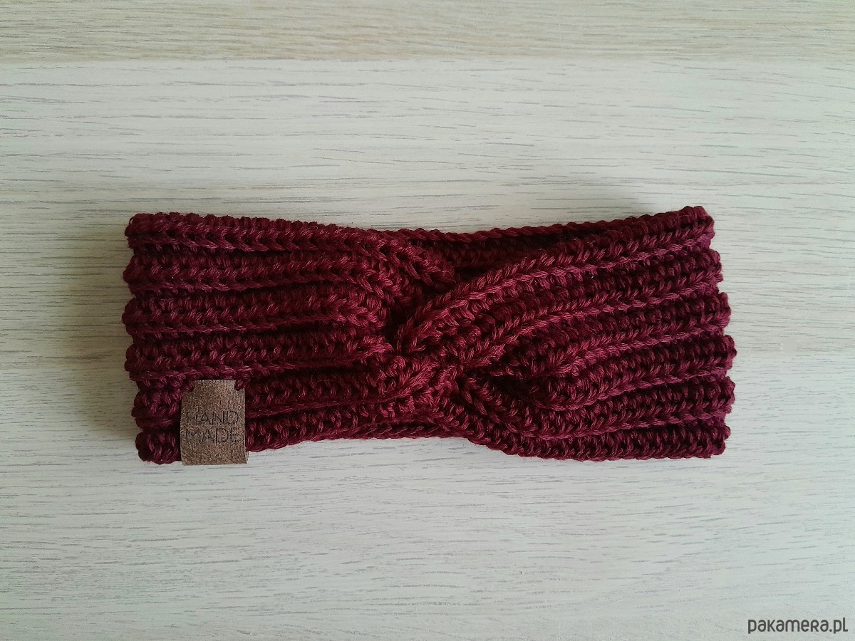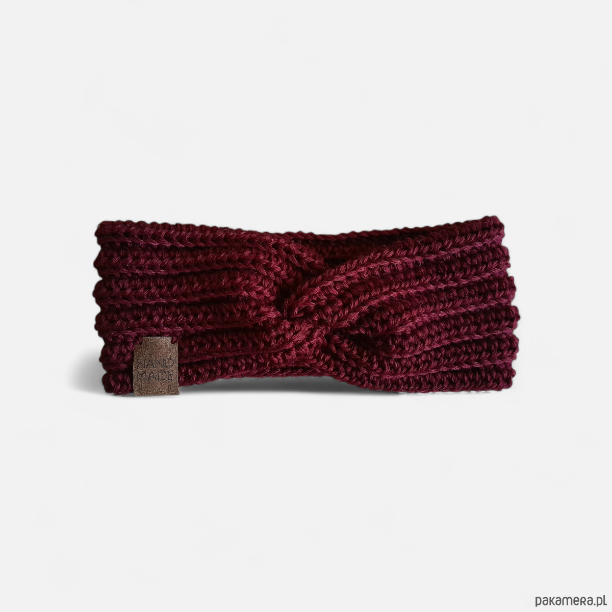 Ręcznie robiona opaska na głowę w kolorze bordowym. Wykonana z mieszanki 50% wełny merino i 50% akrylu, dzięki czemu jest ciepła, a jednocześnie miękka i przyjemna w noszeniu. Materiał dobrze dopasowuje się do kształtu głowy.