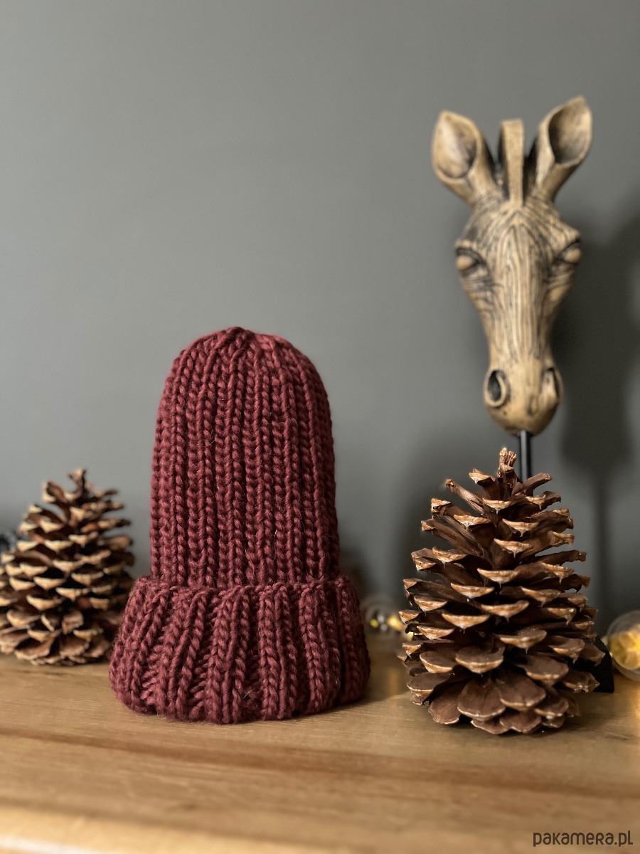 Czapka w kolorze bordowym, wykonana z naturalnej włóczki 100% wełna