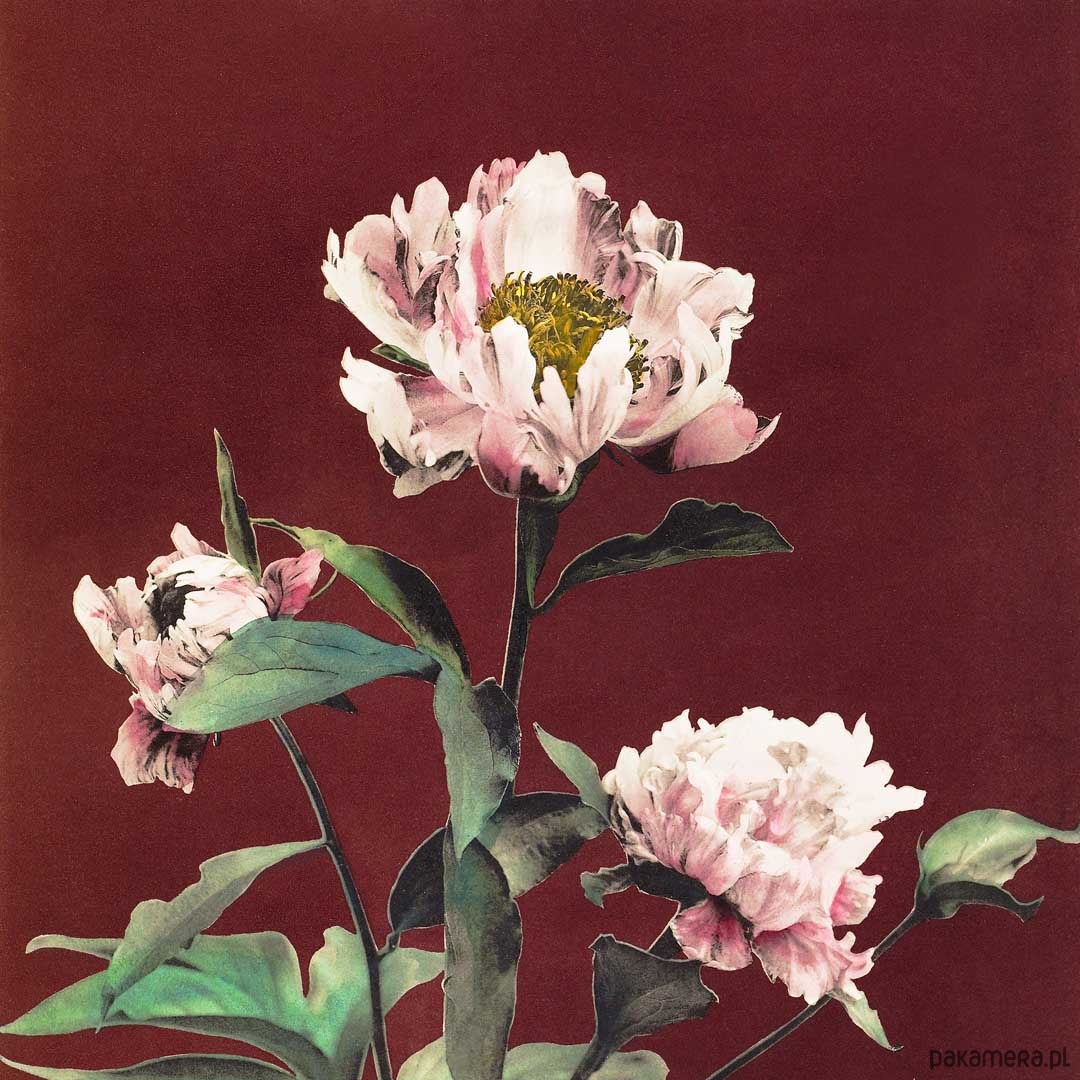 Bordowa poduszka z kwitnącym kwiatem piwonii. Pionierskie techniki wykorzystywane przez Ogawe (autora fotografii) pozwoliły na oddanie wyraźnych barw i stworzyły niespotykany trójwymiarowy efekt.