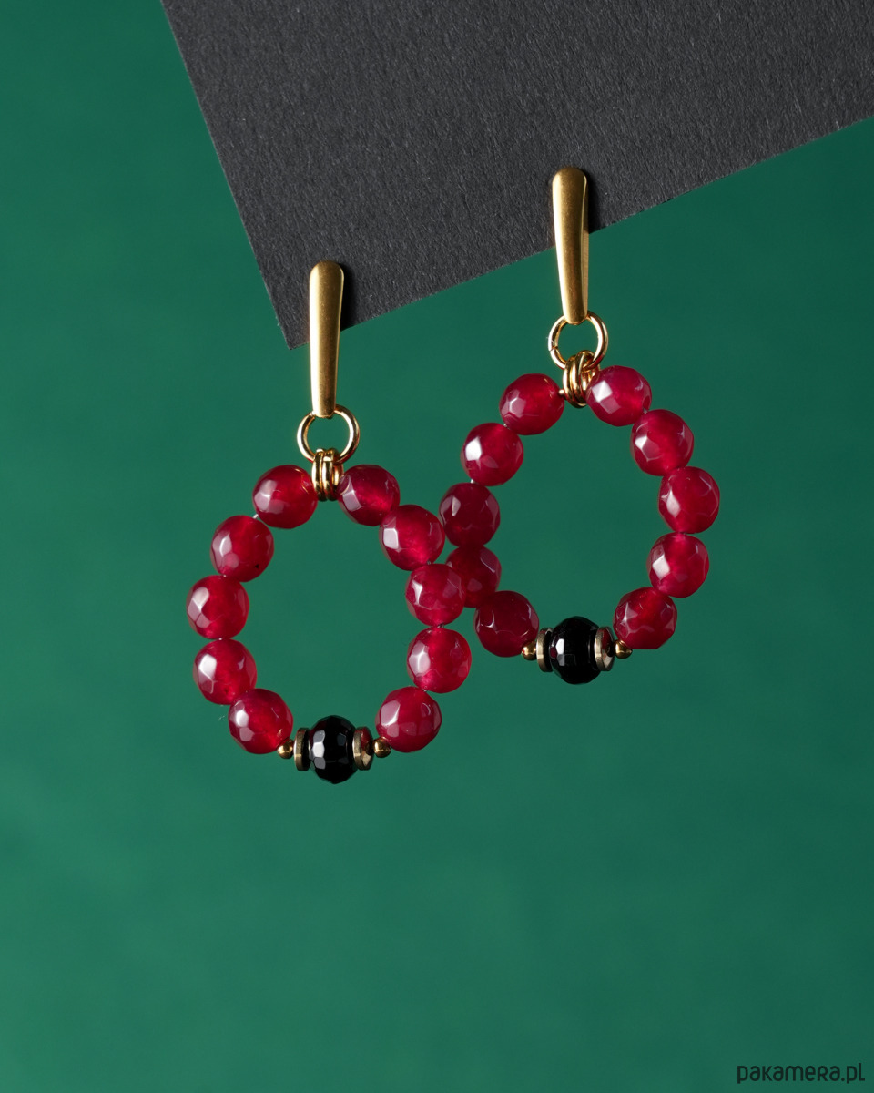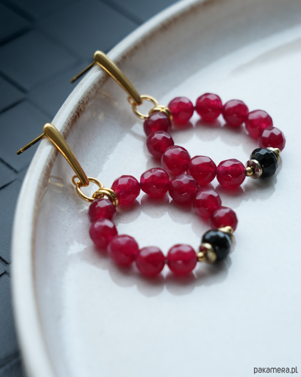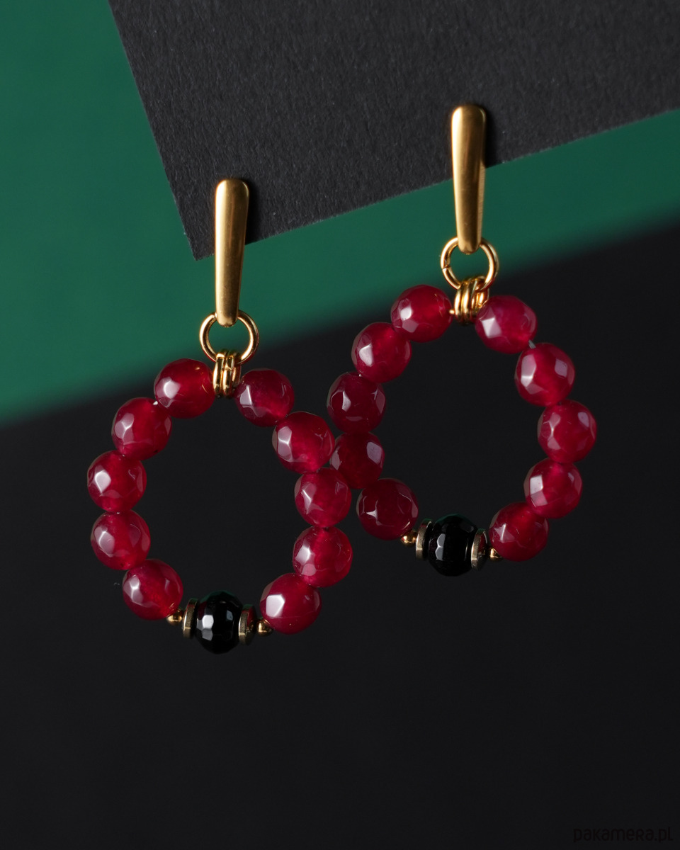 Eleganckie, okrągłe kolczyki z bordowego JADEITU, czarnego ONYKSU i złotego HEMATYTU. Będą idealne do wieczorowych kreacji, ale również do noszenia na co dzień. Oryginalne, podłużne sztyfty są wykonane ze STALI SZLACHETNEJ.