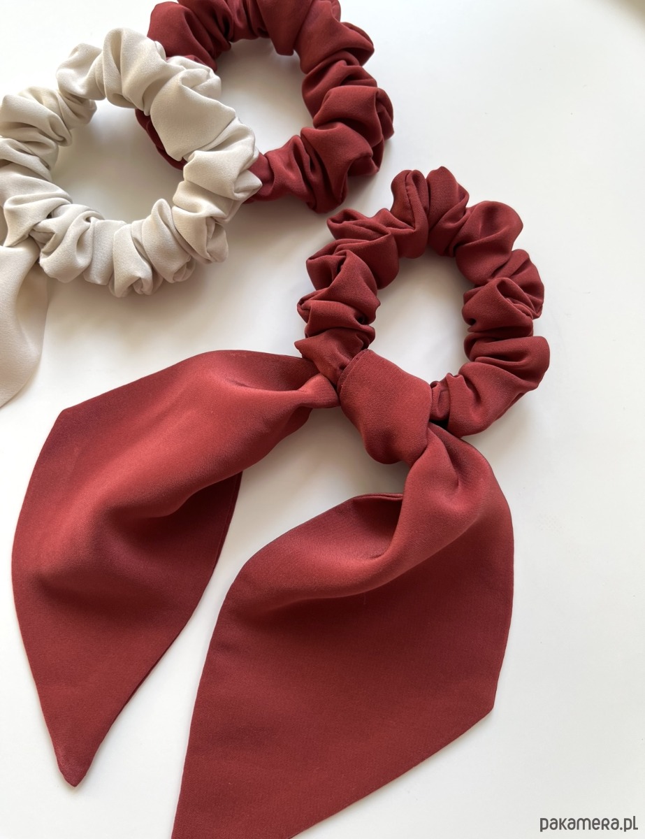 Urocza mini scrunchie Wilma z szarfą w kolorze bordowo-cegiełkowym to połączenie delikatności, funkcjonalności i wyjątkowego uroku.