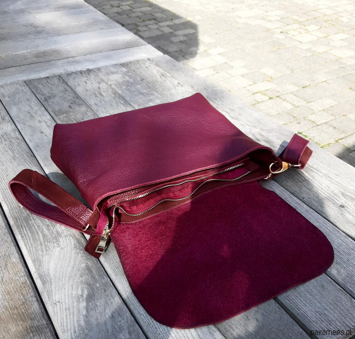 Bordowo - fuksjowa duża miękka listonoszka. Uszyta ze skóra naturalnej, mięsistej, groszkowej.