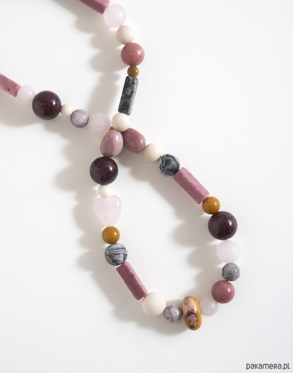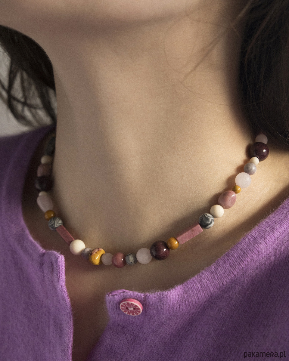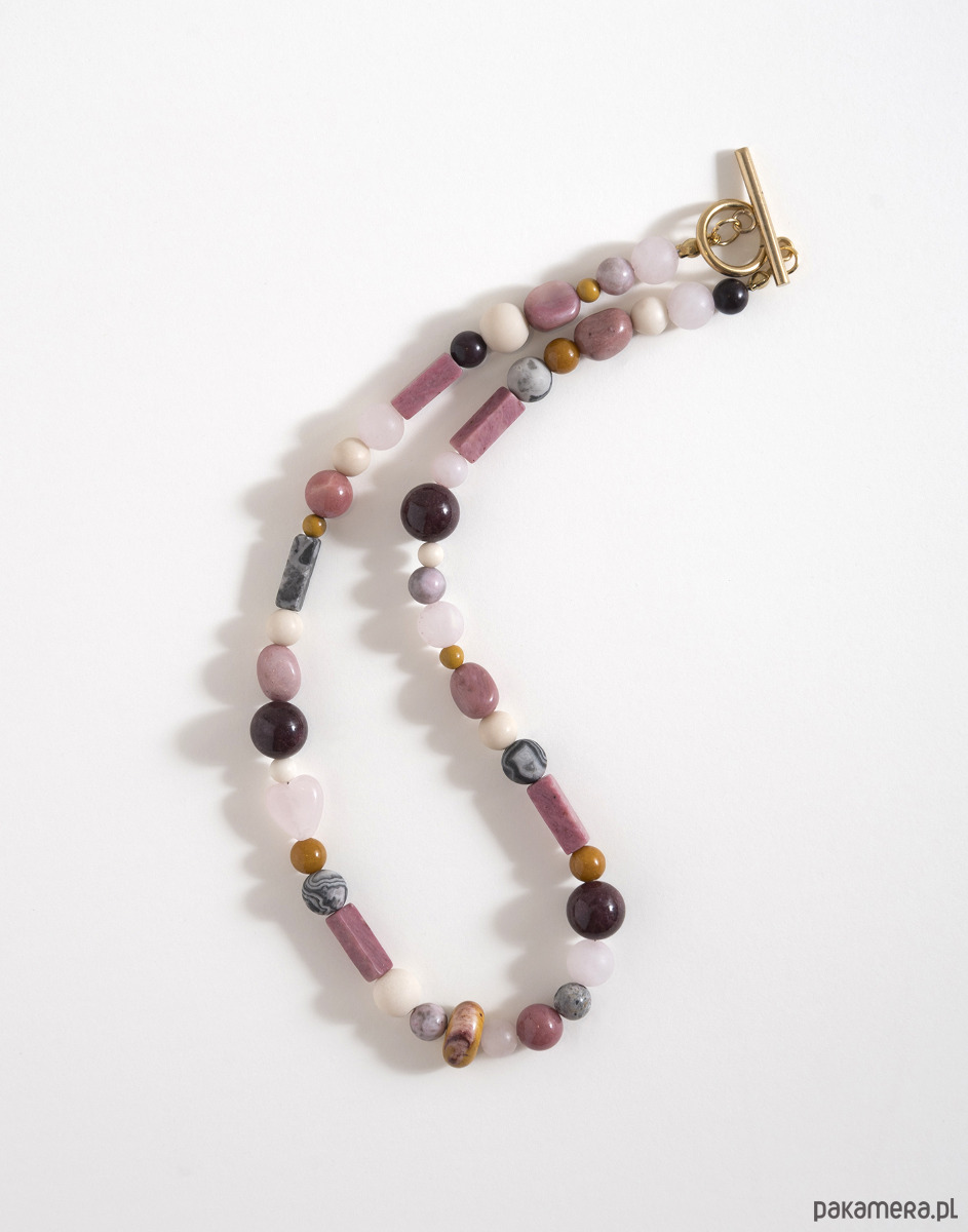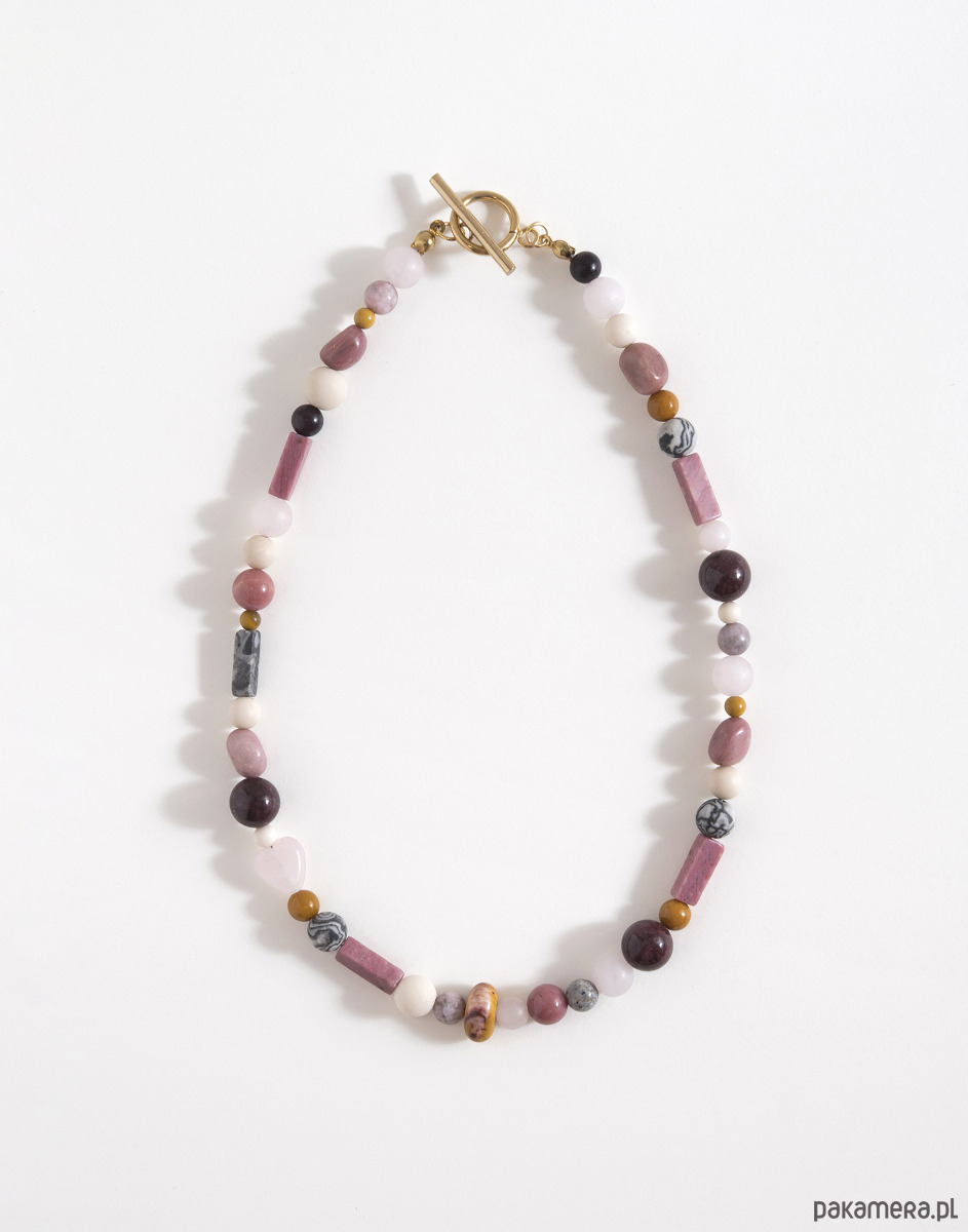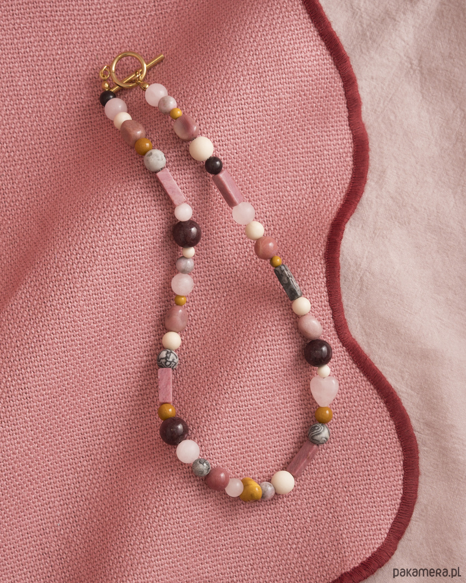 Naszyjnik w bordowo-różowej tonacji wykonano z naturalnych kamieni o różnych wielkościach i kształtach: jaspisu, agatu, jadeitu, kamienia rzecznego, rodonitu oraz kwarcu różowego.