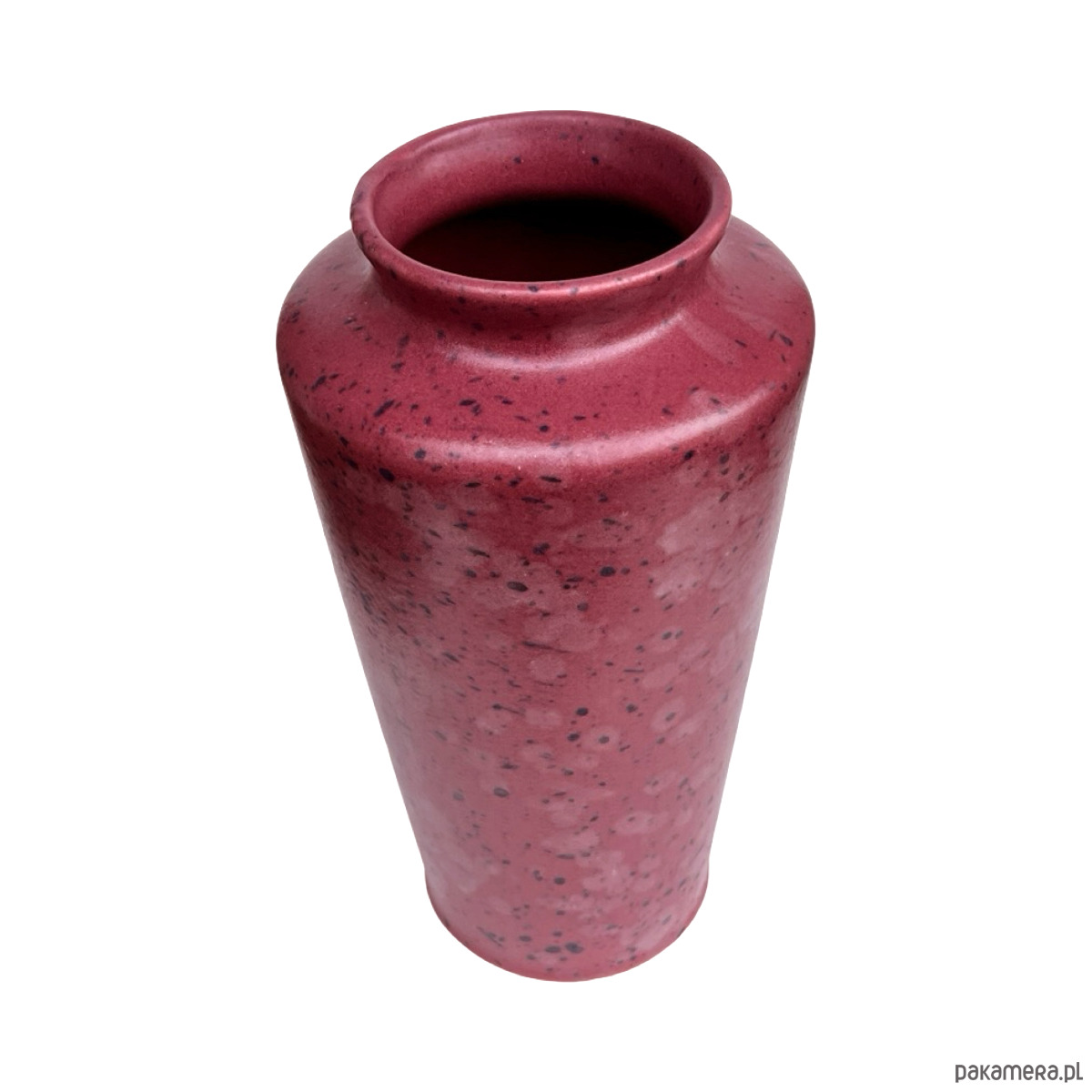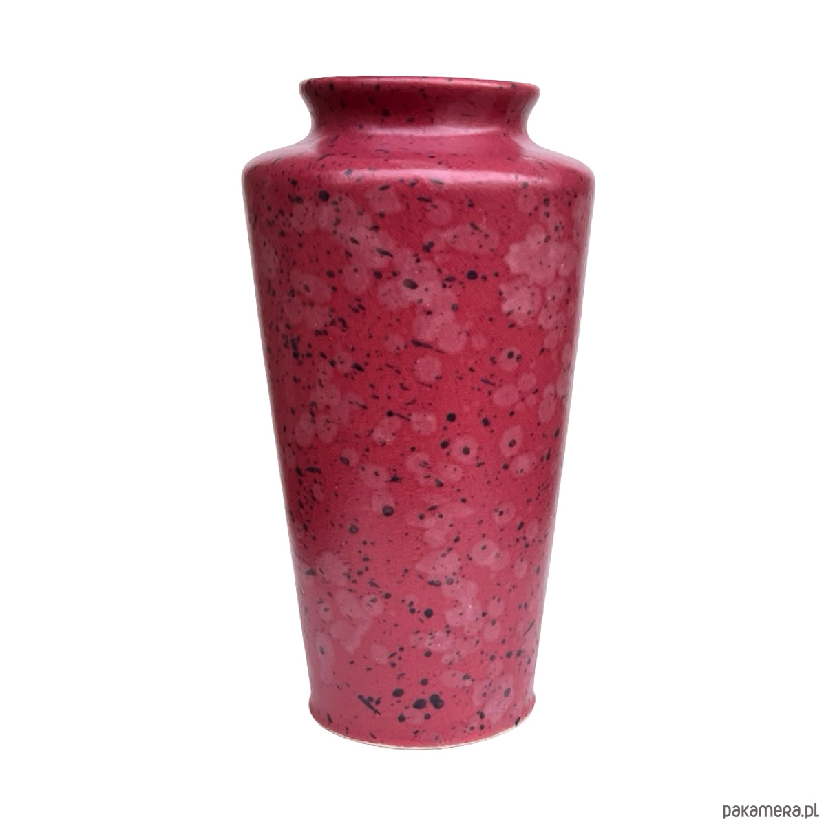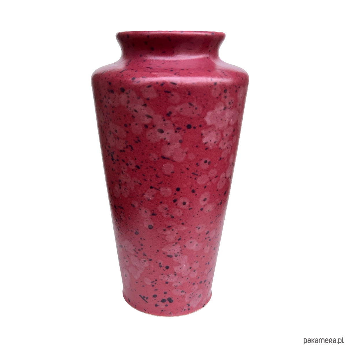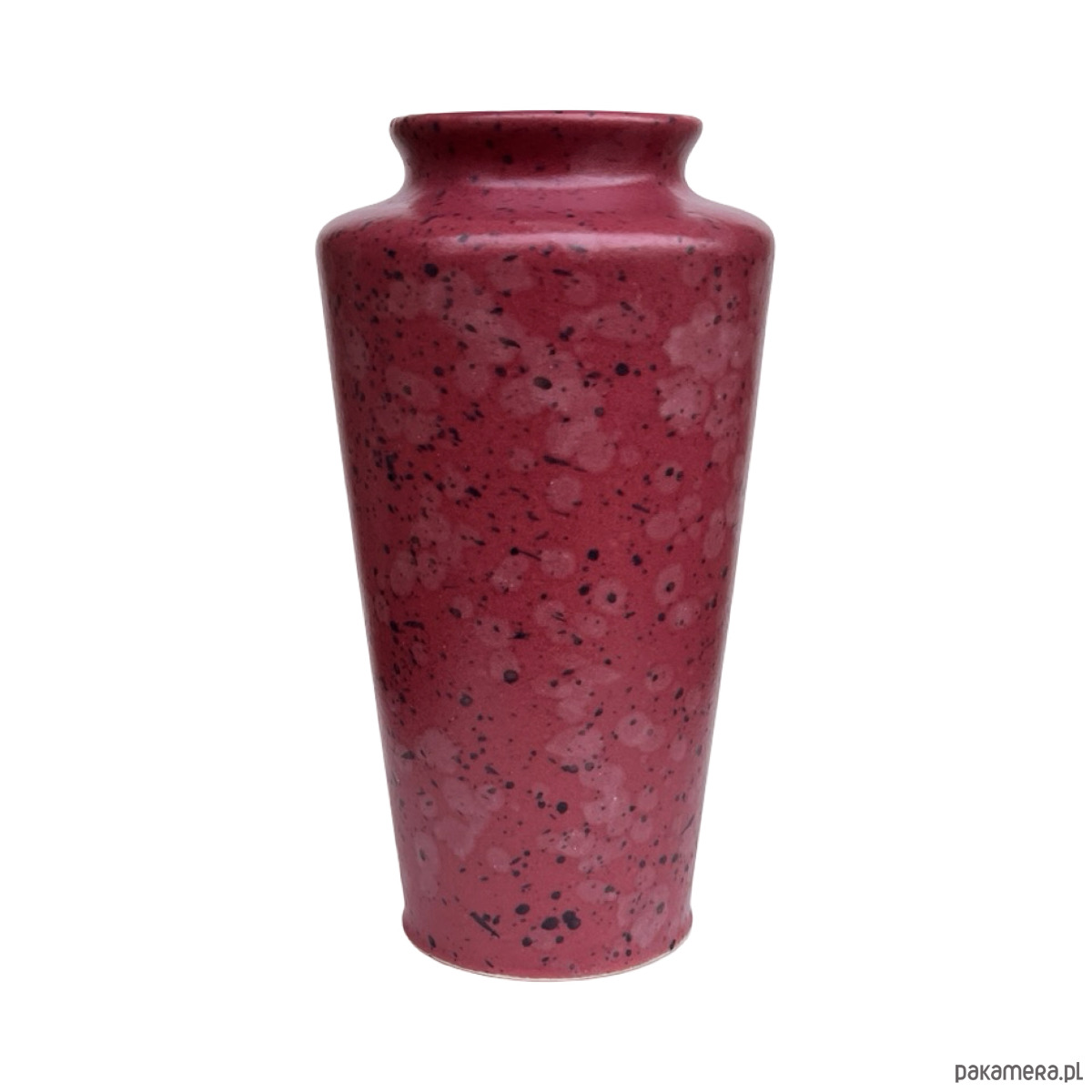 Ceramiczny wazon w stylu mid-century modern z ręcznie malowaną malaturą w stylu new look wyprodukowany w latach 80. przez MF Design w Niemczech. Kolor to jasnobordowy wpadający w różowy z cętkami. Wazon o klasycznej formie zachowany w stanie oryginalnym bardzo dobrym. Przedmiot sygnowany 50030.