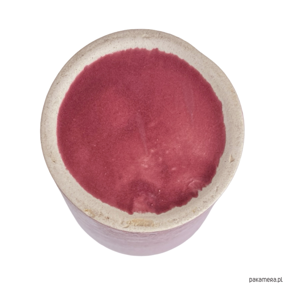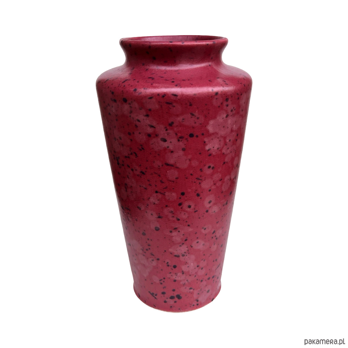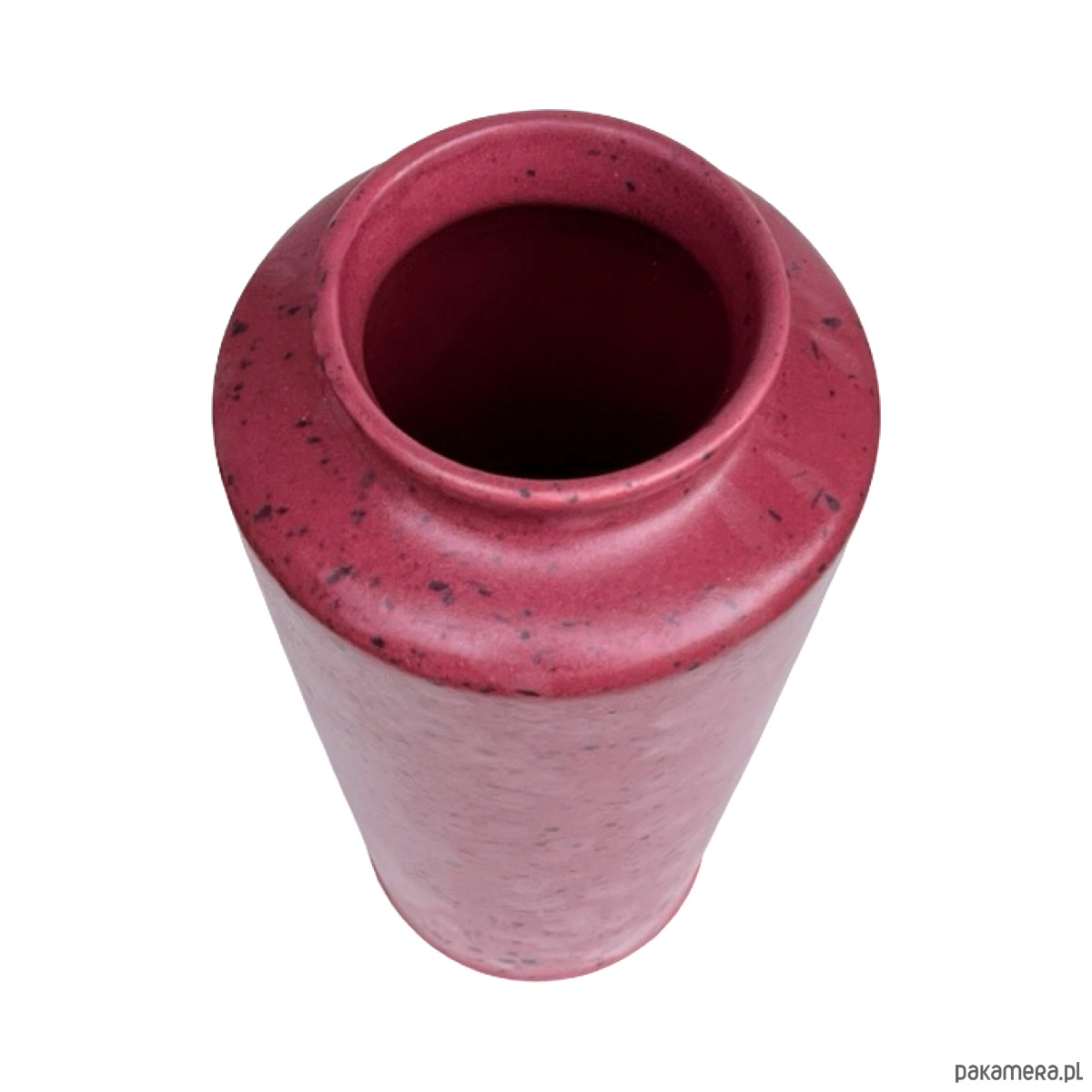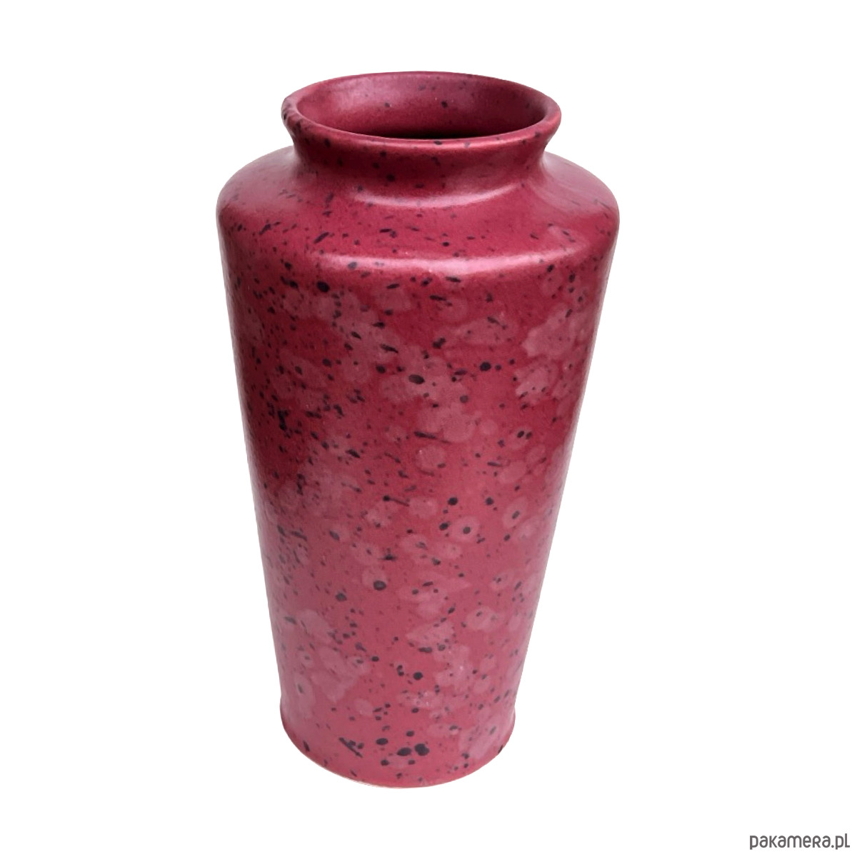 Ceramiczny wazon w stylu mid-century modern z ręcznie malowaną malaturą w stylu new look wyprodukowany w latach 80. przez MF Design w Niemczech. Kolor to jasnobordowy wpadający w różowy z cętkami. Wazon o klasycznej formie zachowany w stanie oryginalnym bardzo dobrym. Przedmiot sygnowany 50030.