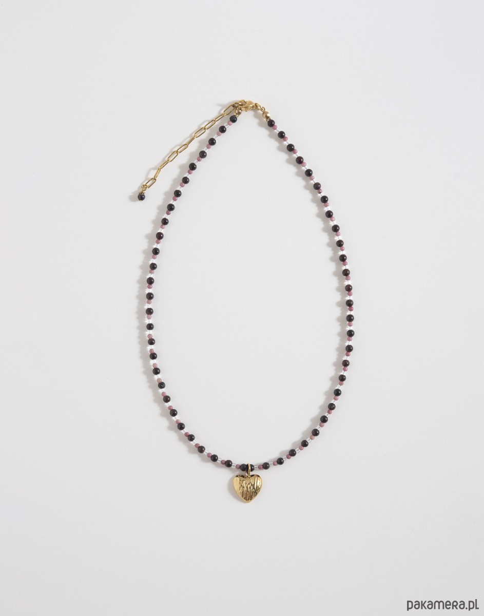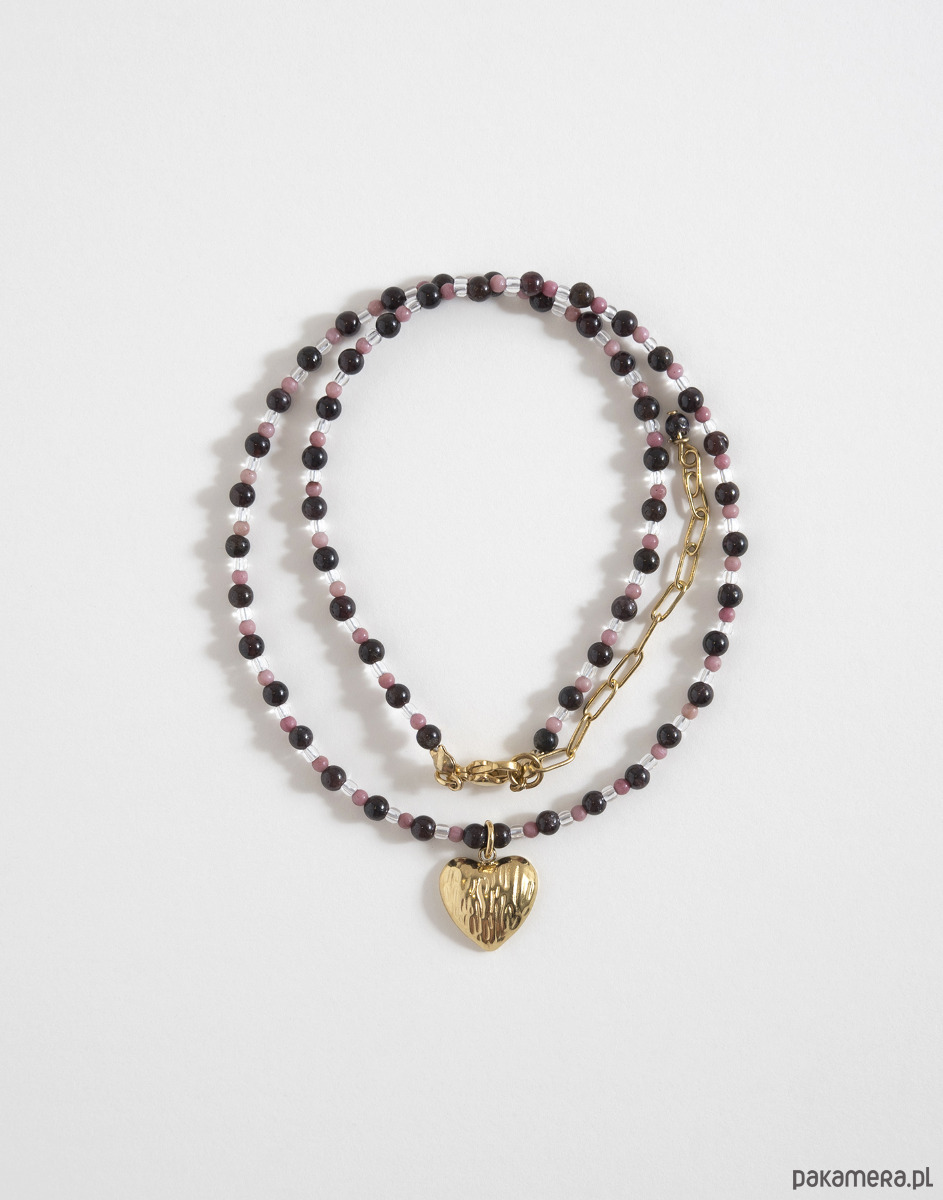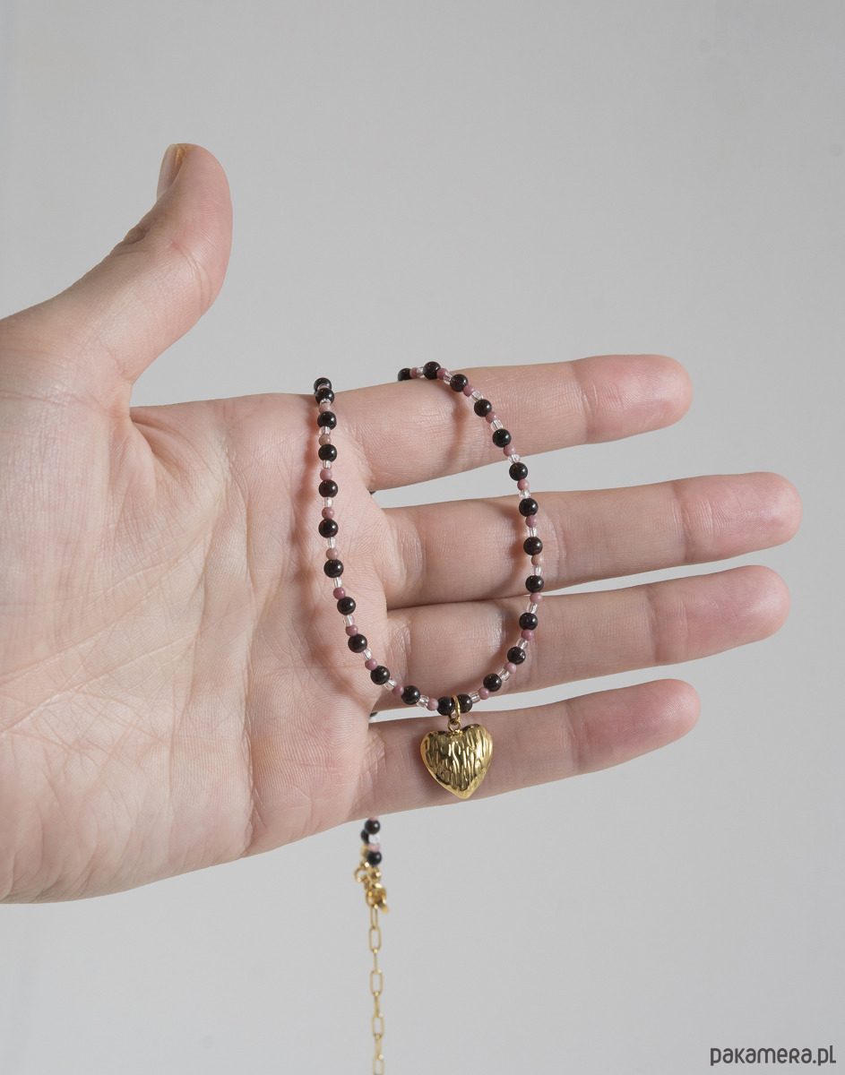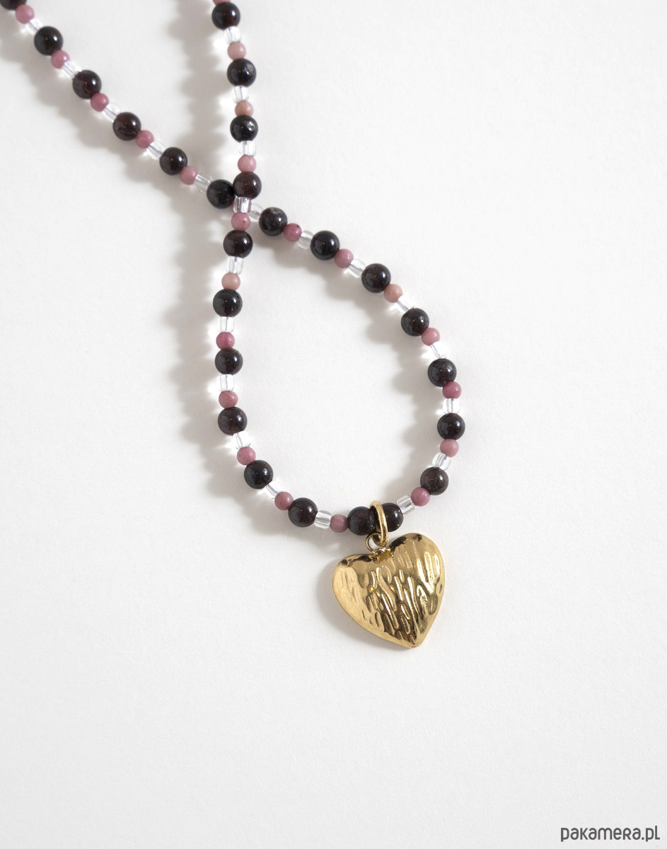 Naszyjnik wykonano ręcznie z szklanych przezroczystych koralików oraz kamieni naturalnych: granatu i rodonitu. Zawieszka w kształcie serca oraz elementy zapięcia zostały wykonane ze złotej stali chirurgicznej.