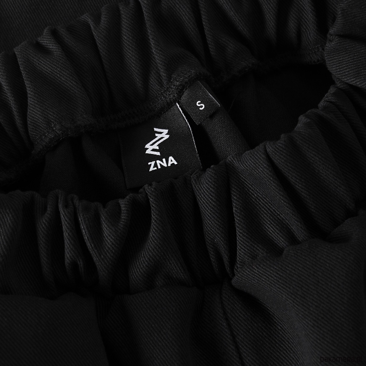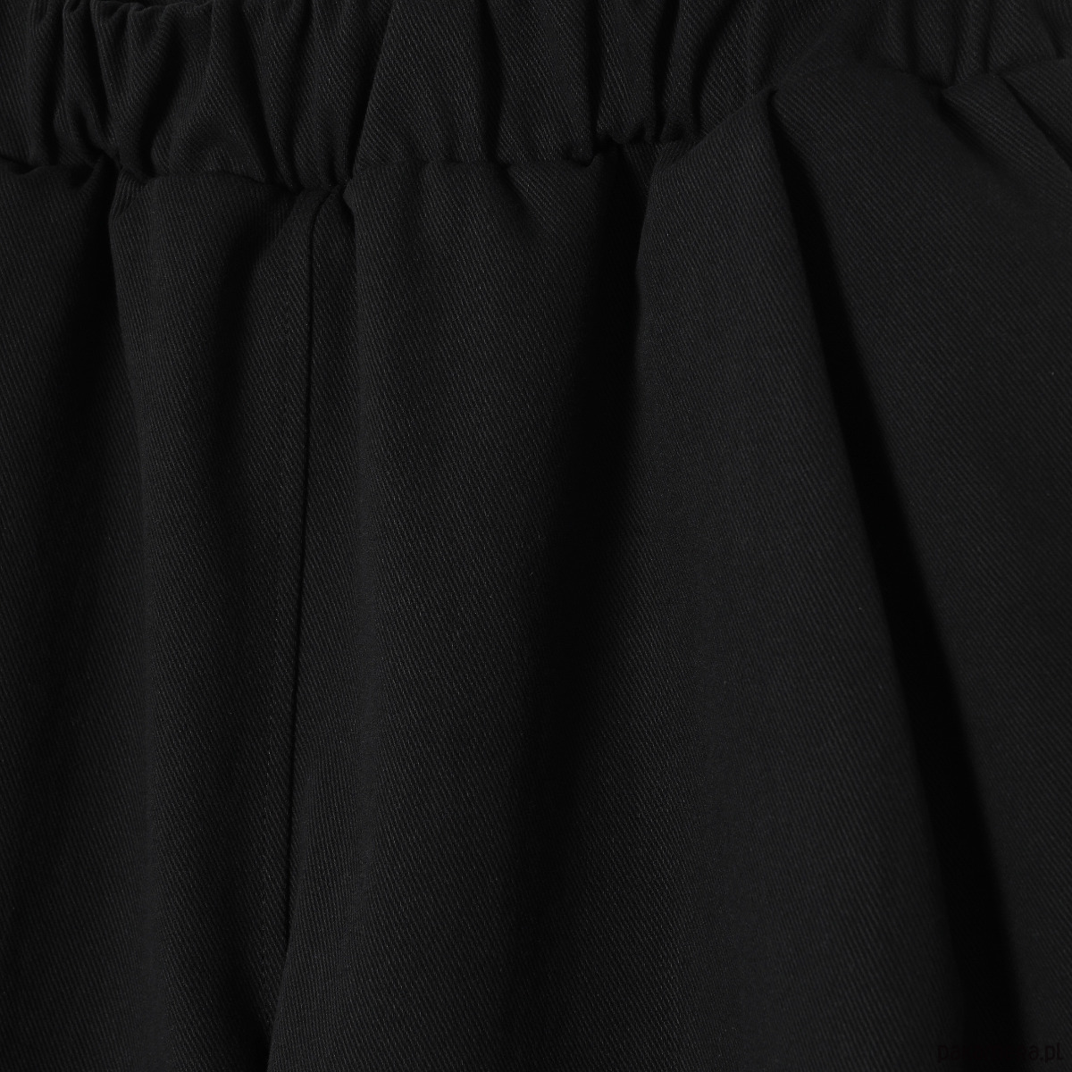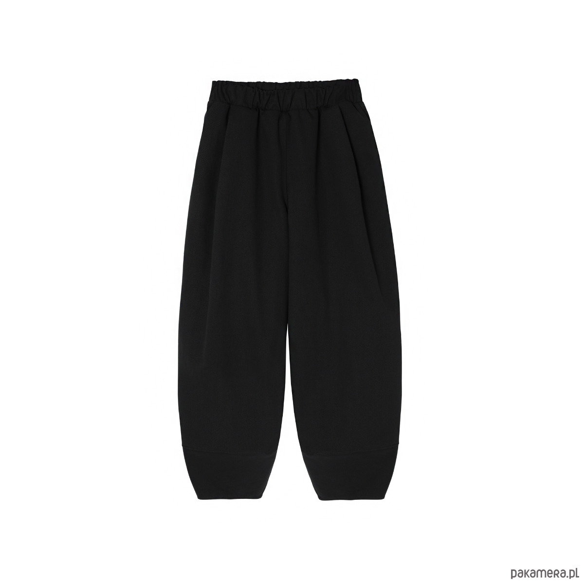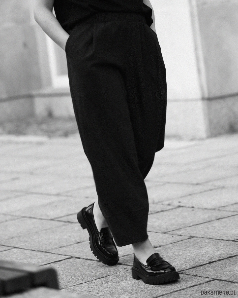 Przód spodni urozmaicają symetrycznie rozmieszczone szerokie zaszewki. Po bokach dwie cięte kieszenie. Góra wykończona szerokim pasem z wszytą wewnątrz gumą. Dół nogawki wykończony jest ciekawym elementem, zamyka je zwężany kielich, który kończy się tuż nad kostką.