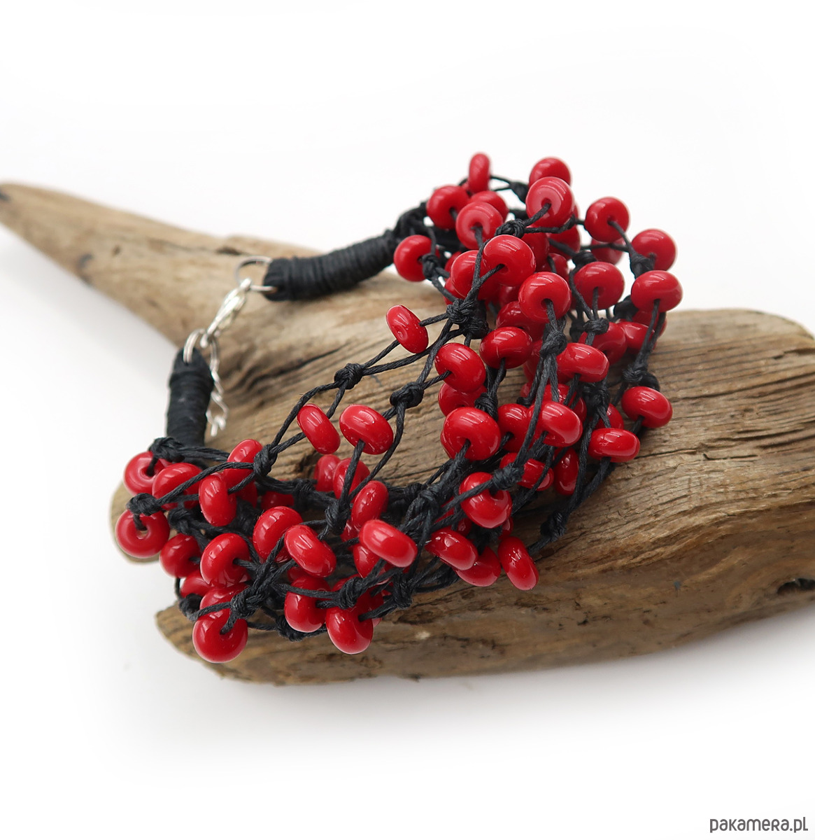 Elegancka bransoleta utrzymana w tonacji głębokiej czerni i soczystych karminów, wykonana na bazie polskiej przędzy lnianej. Wplecione zostały piękne szklane korale czeskiej firmy Jablonex, które nadają całości wyrazistego, artystycznego charakteru.