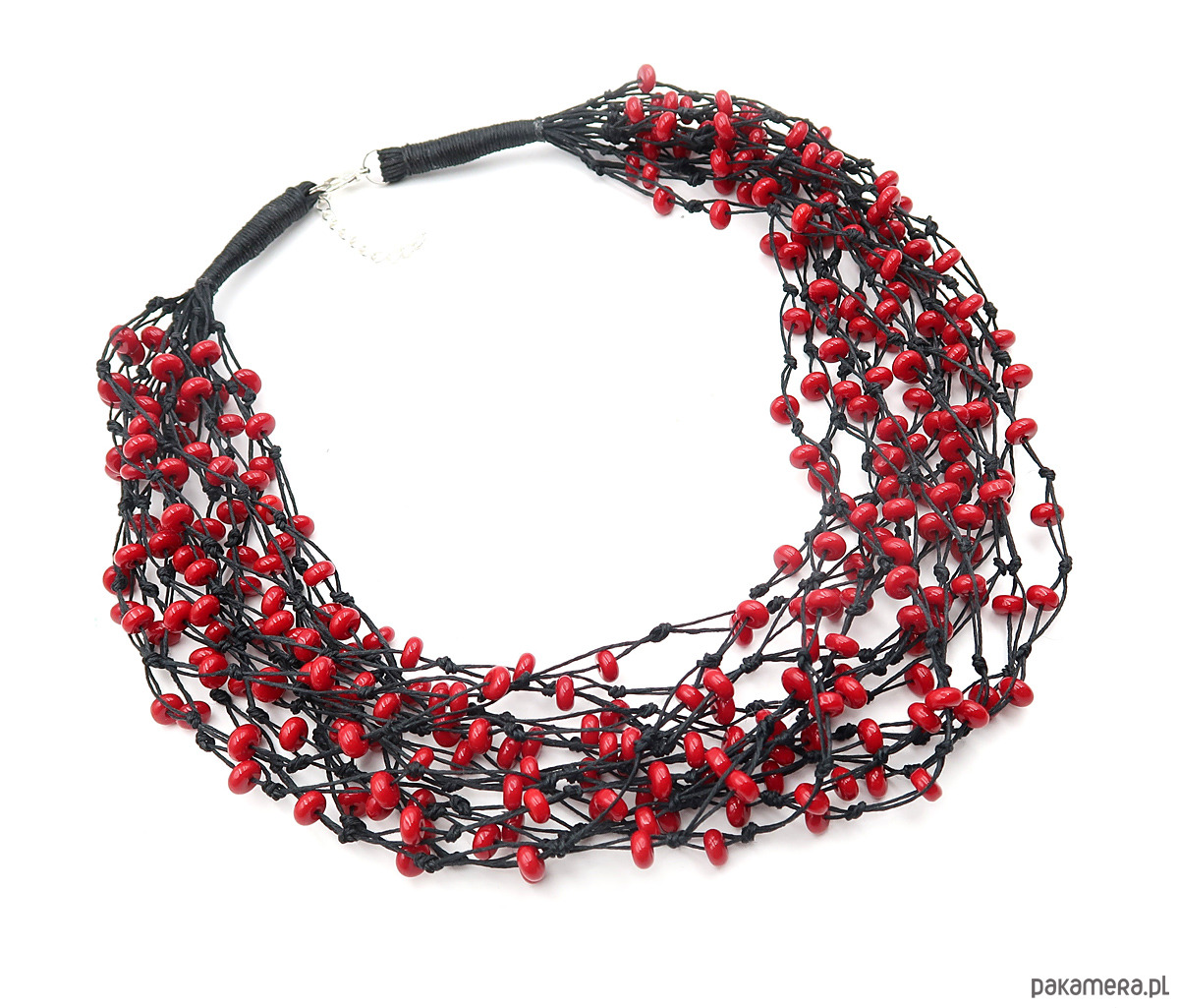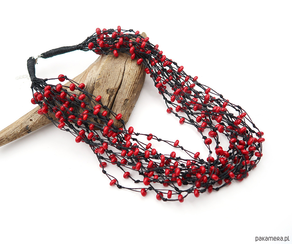 Wyjątkowy naszyjnik utrzymany w tonacji głębokiej czerni i soczystych karminów, wykonany na bazie polskiej przędzy lnianej. W splocie wykorzystano piękne szklane korale czeskiej firmy Jablonex, które nadają całości artystycznego i wyrazistego charakteru.