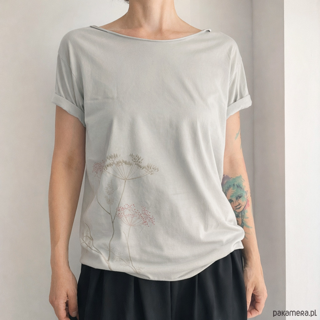 Lekka, luźna, kobieca koszulka. Tshirt z opadającym dekoltem z botanicznym wzorem i niecodziennym miejscu. Mamy pomysł na takie nadruki nie do końca w klasycznej formie.