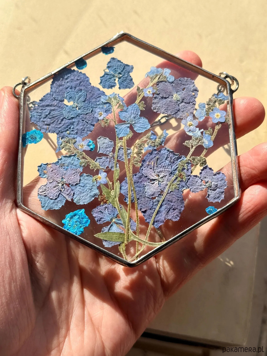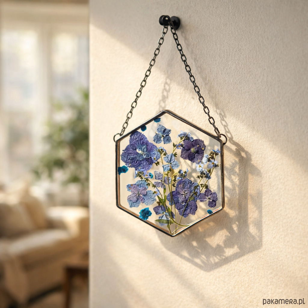 Ręcznie wykonany dekor ścienny w kształcie heksagonu z prawdziwymi suszonymi roślinami zamkniętymi pomiędzy dwiema taflami przezroczystego szkła.