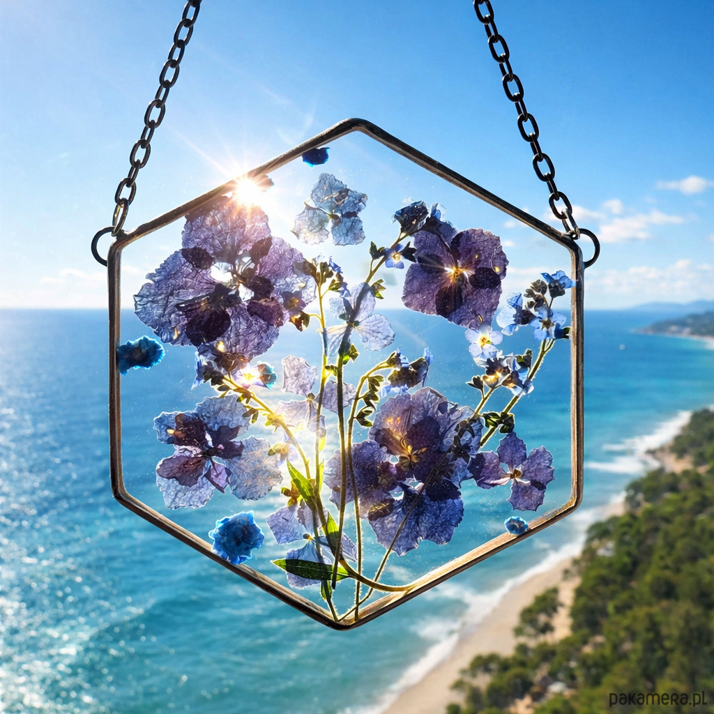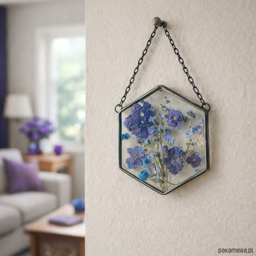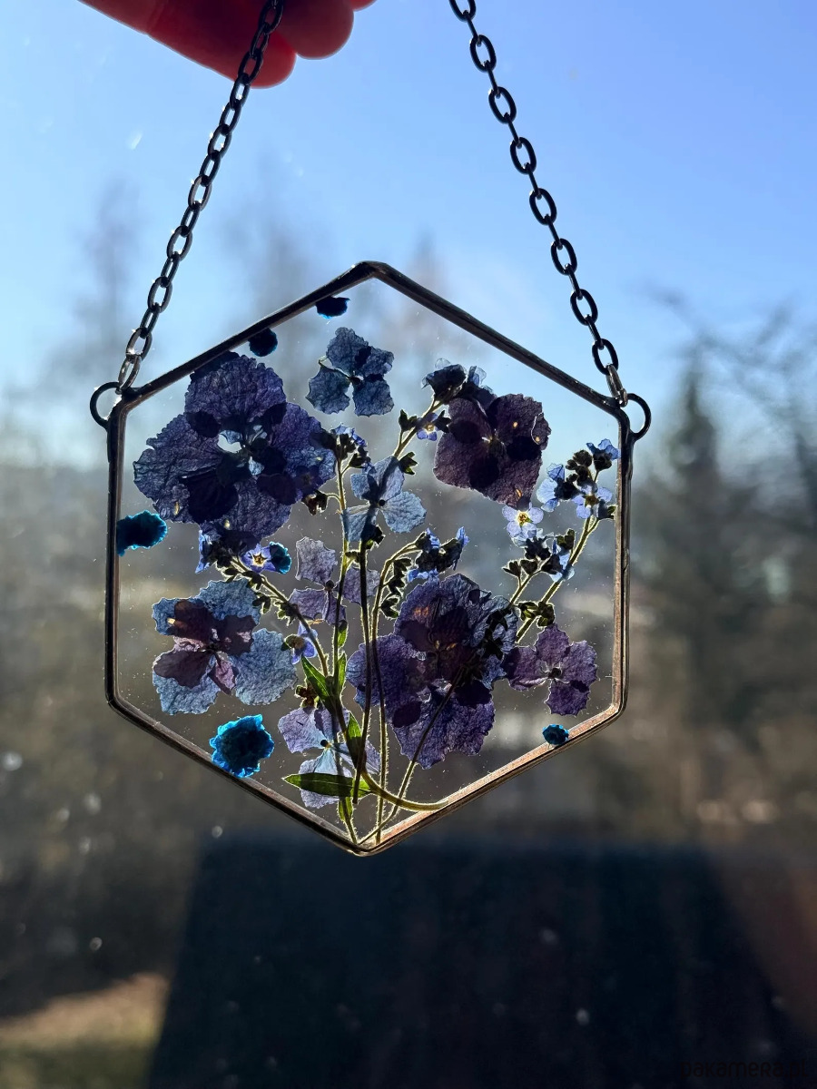 Dekor pięknie prezentuje się zawieszony w oknie lub na ścianie. Pod światło rośliny delikatnie się rozświetlają i tworzą subtelną, naturalną ozdobę wnętrza.