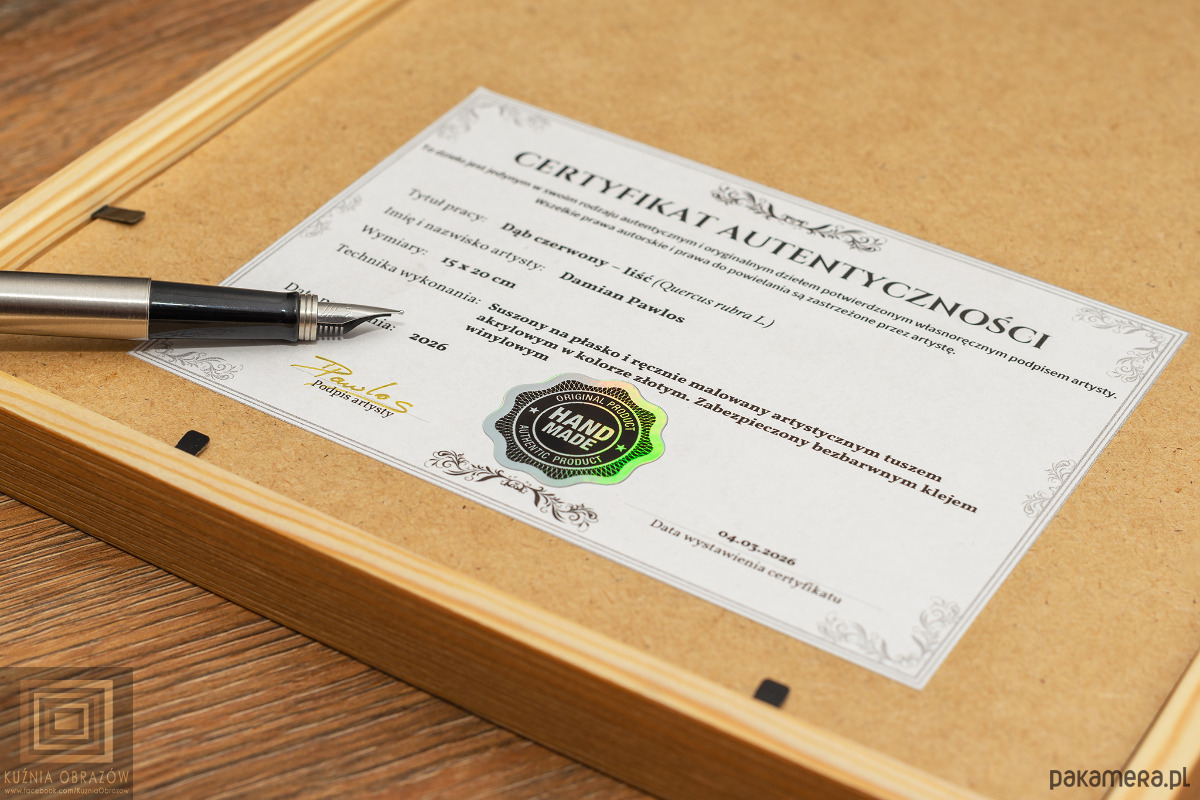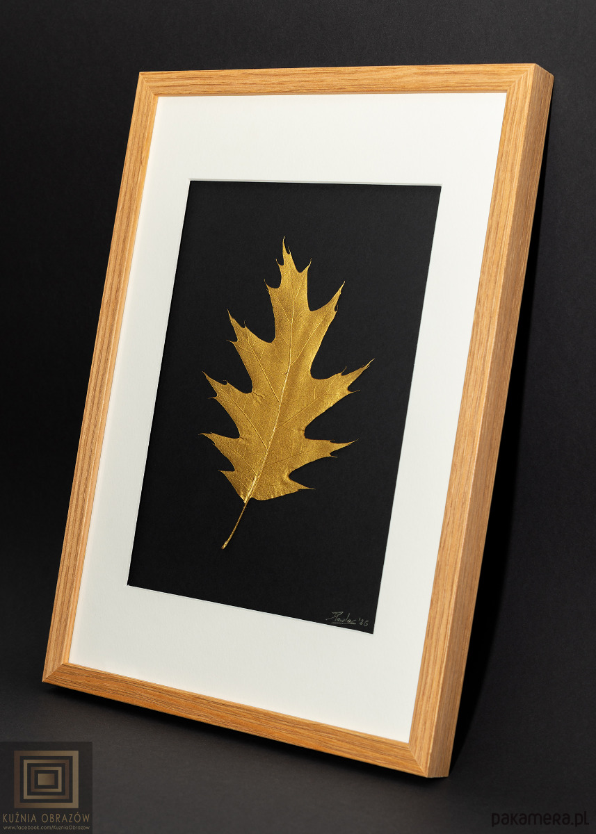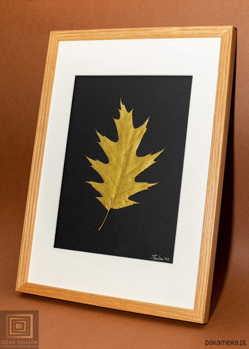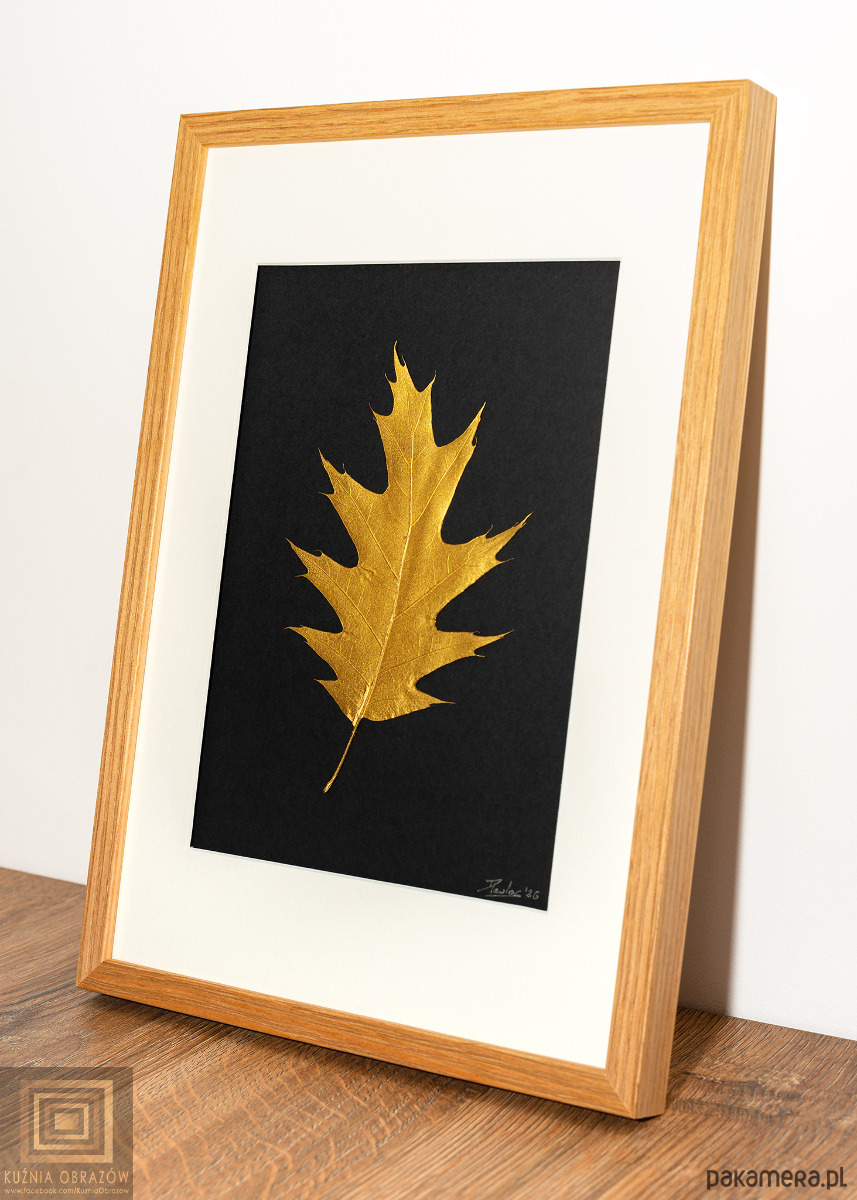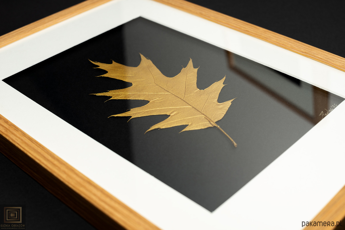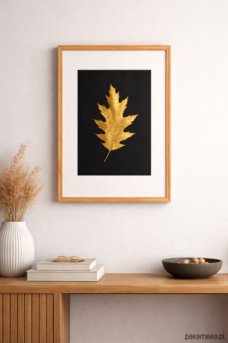 Elegancki obraz ze złotym liściem dębu w solidnej dębowej oprawie to wyjątkowa dekoracja łącząca naturalne piękno z ponadczasową symboliką siły i trwałości.
