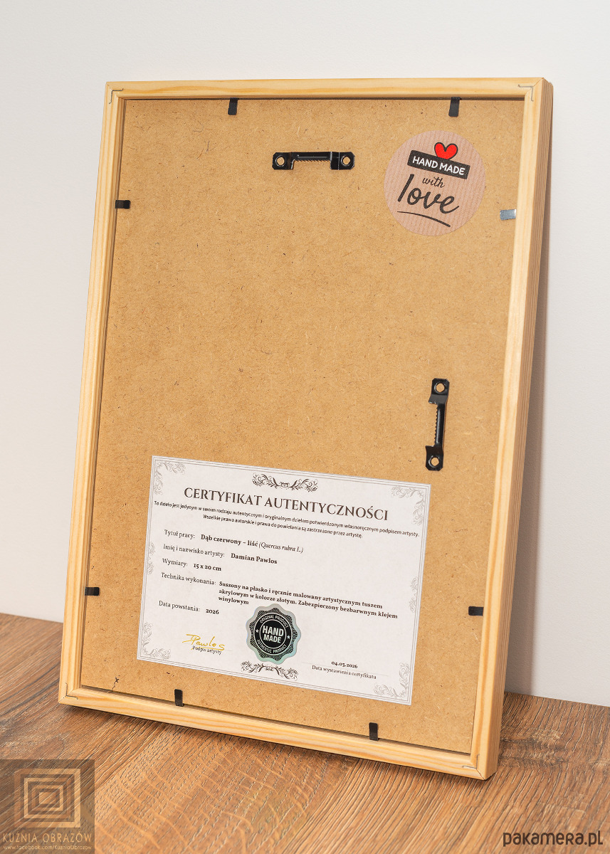 Praca oprawiona w elegancką ramkę z litego drewna o wymiarach 20x30 cm z białym passe-partout i szklaną szybką. Zastosowano passe-partout z niewielkim dystansem, który zwiększa wrażenie głębi, tworząc delikatny cień i potęgując efekt 3D całej kompozycji.