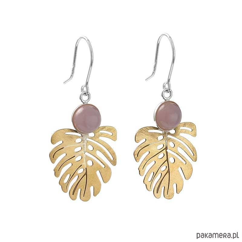 Kolczyki z agatami i zawieszkami w kształcie liści monstery to nietuzinkowa propozycja dla fanek roślin, złota i różu. Biżuteria została ręcznie wykonana z agatu o średnicy 8 milimetrów, listków z fakturowanego i polerowanego mosiądzu w kolorze złota oraz srebrnych elementów wykończeniowych. Połączenie nowoczesnych kształtów z ponadczasowymi kolorami daje wyjątkowy efekt wizualny. Kolczyki sprawdzą się jako dodatek zarówno do stylizacji dziennych, jak i wieczorowych. Połączenie modnego motywu tropikalnych liści z kolorem uczucia i naturalnymi kamieniami sprawia, że prezentują się znakomicie.