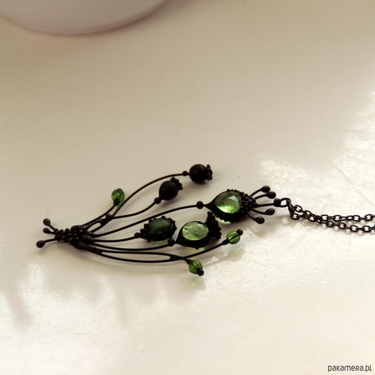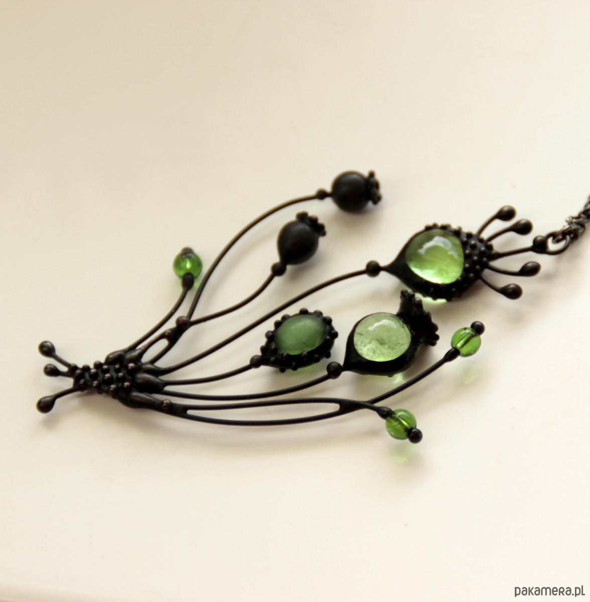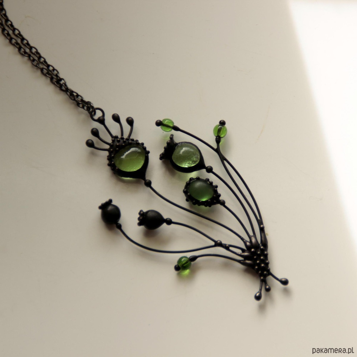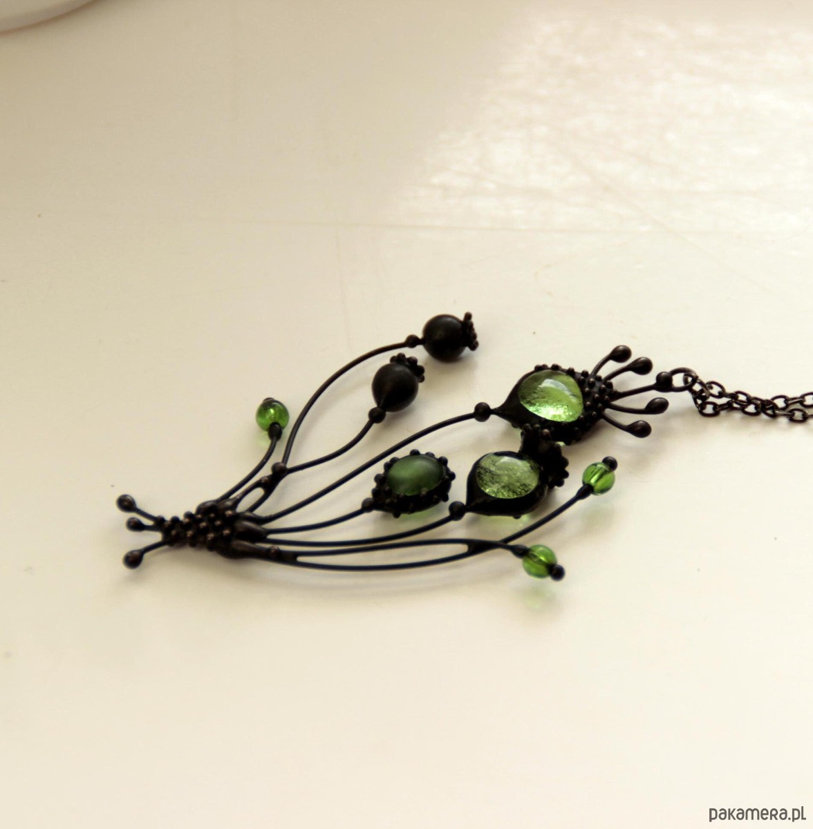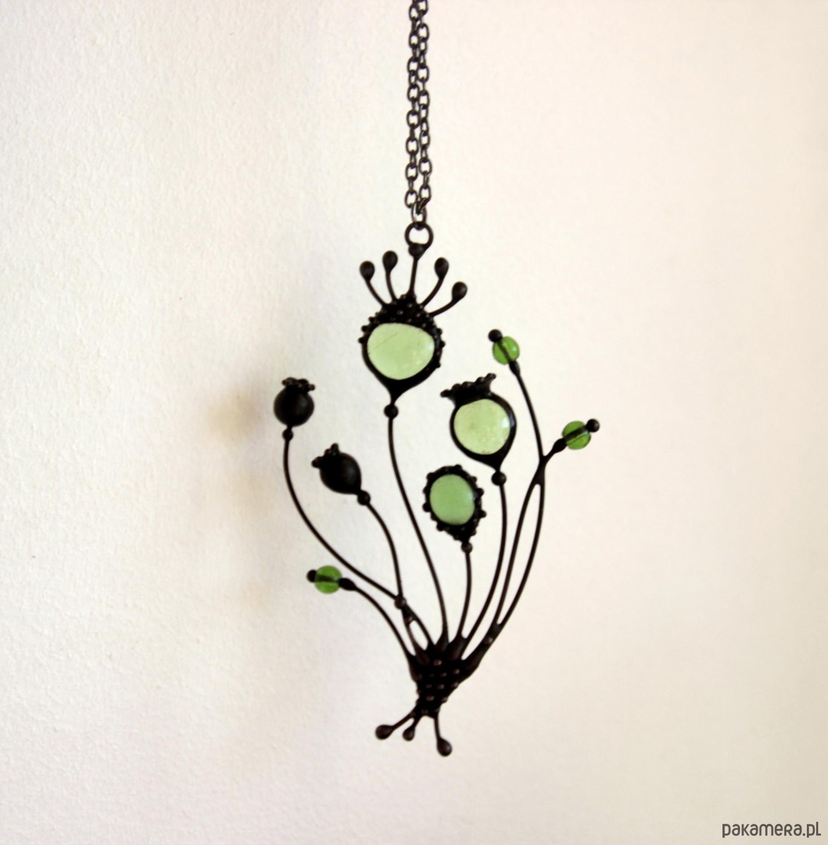 Naszyjnik botaniczny z motywem maków w stylu boho, wykonany ręcznie z miedzi, stopu cyny, stali i zielonego szkła. Pokryty środkiem przeciwutleniającym. Naszyjnik jest lekki i wytrzymały. Stop cyny i miedzi pokryty jest czarną patyną, która nadaje metalowi czarny kolor, a następnie wypolerowany roztworem wykończeniowym, aby nadać biżuterii szlachetny wygląd i jednocześnie zapobiec utlenianiu się metalu. Unikalny i wytrzymały wisiorek boho z makiem ze szkła witrażowego. Rozmiar około 4/7 cm. Kolor czarny/zielony.