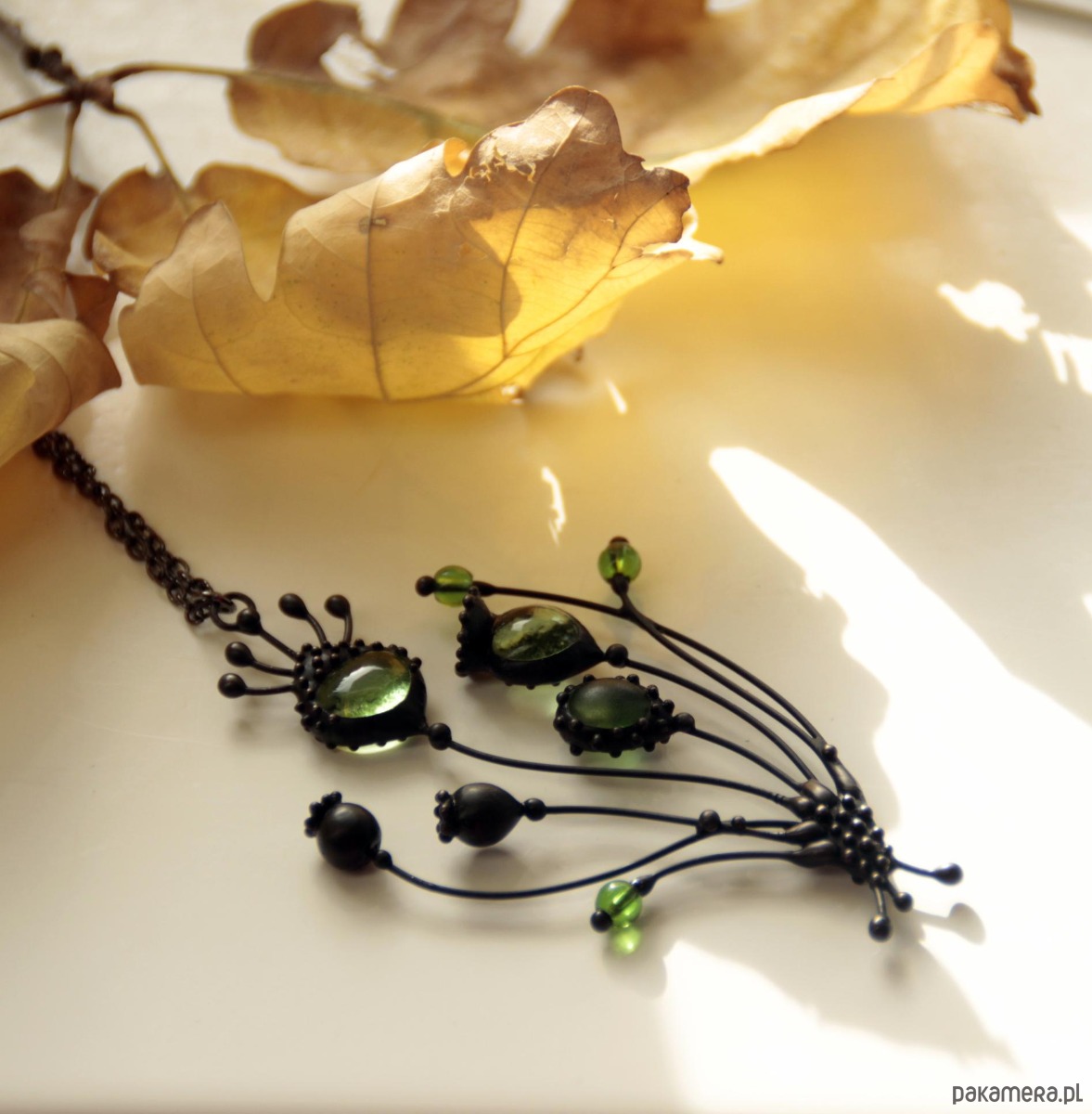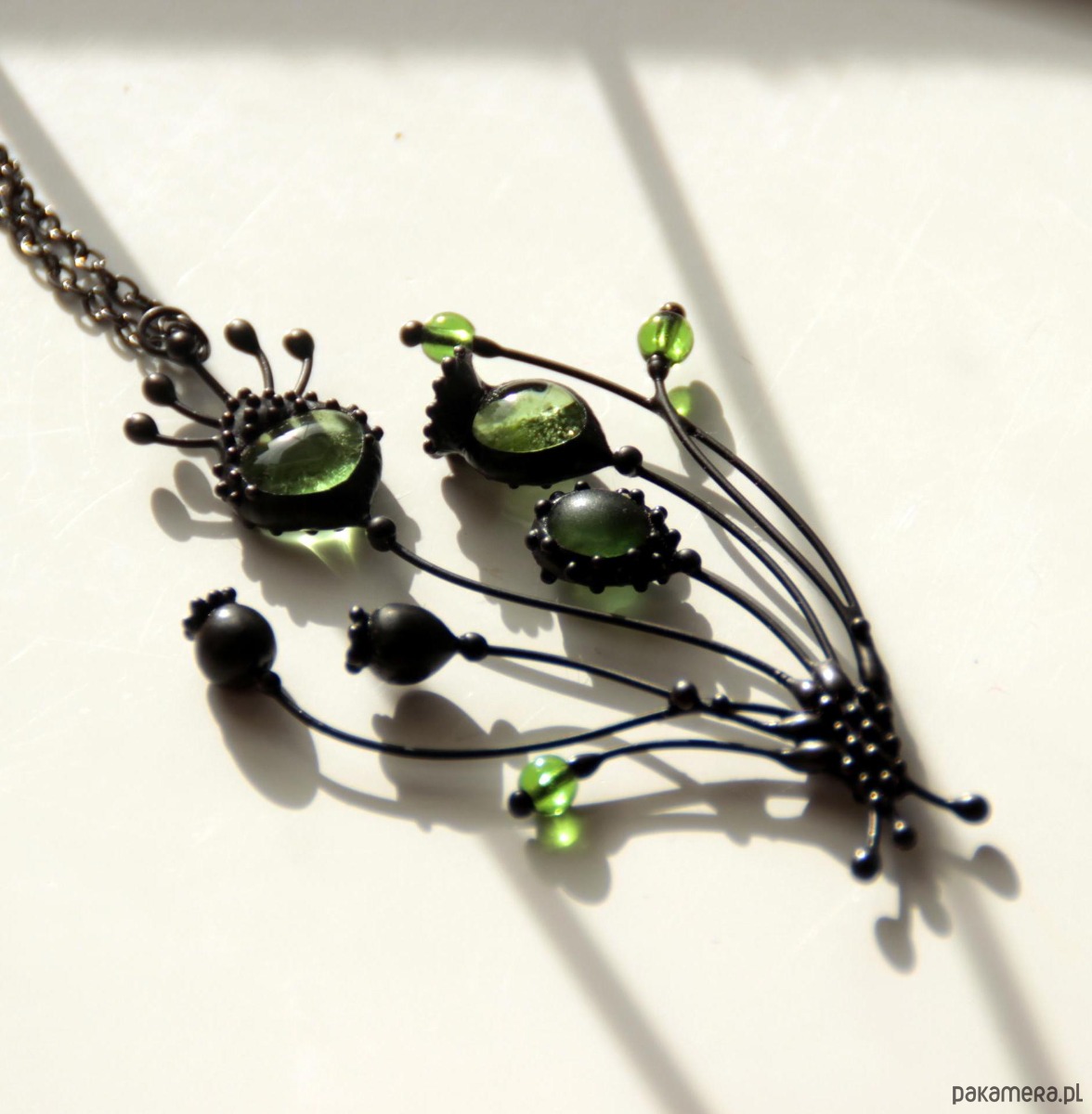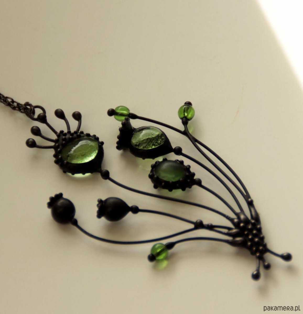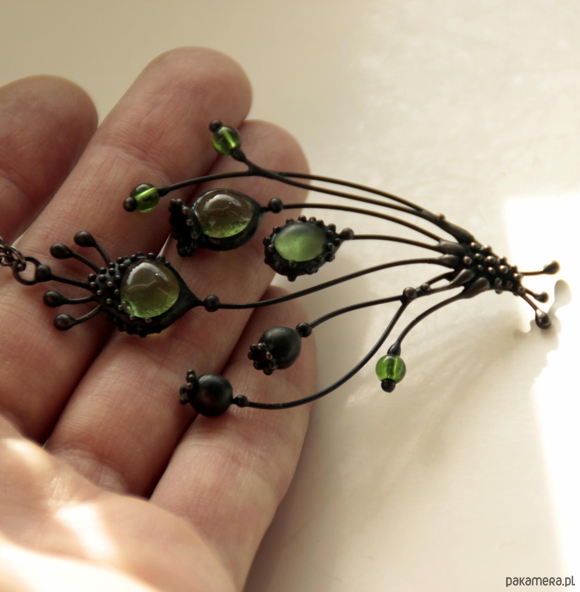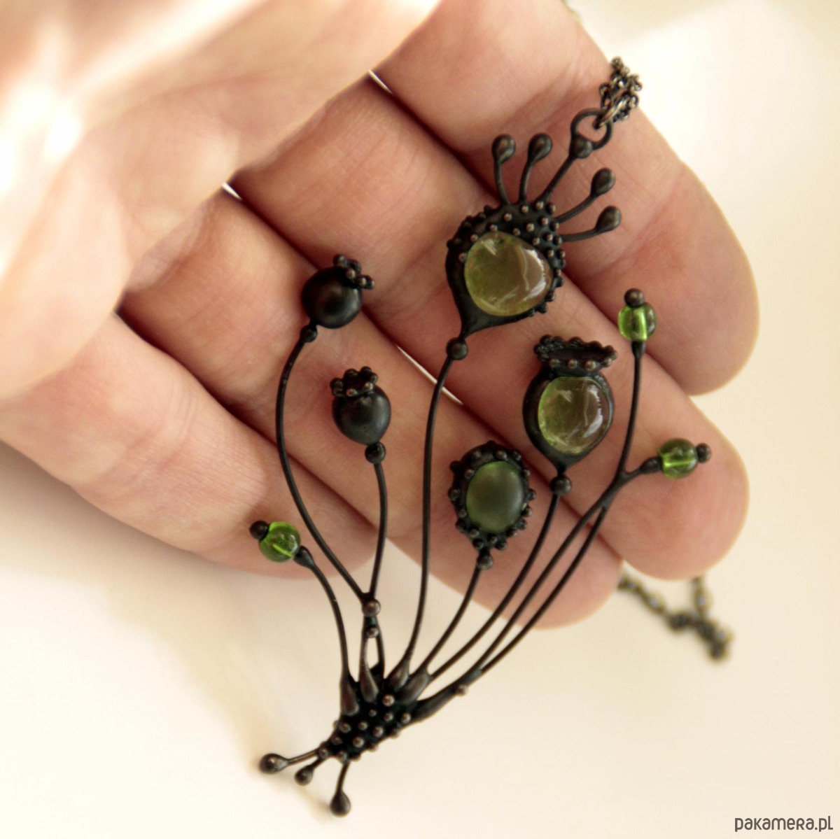 Naszyjnik botaniczny z motywem maków w stylu boho, wykonany ręcznie z miedzi, stopu cyny, stali i zielonego szkła. Pokryty środkiem przeciwutleniającym. Naszyjnik jest lekki i wytrzymały. Stop cyny i miedzi pokryty jest czarną patyną, która nadaje metalowi czarny kolor, a następnie wypolerowany roztworem wykończeniowym, aby nadać biżuterii szlachetny wygląd i jednocześnie zapobiec utlenianiu się metalu. Unikalny i wytrzymały wisiorek boho z makiem ze szkła witrażowego. Rozmiar około 4/7 cm. Kolor czarny/zielony.