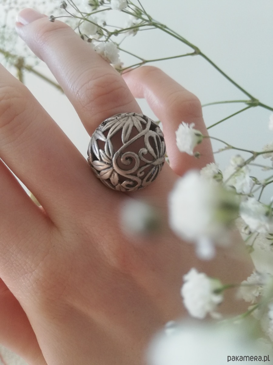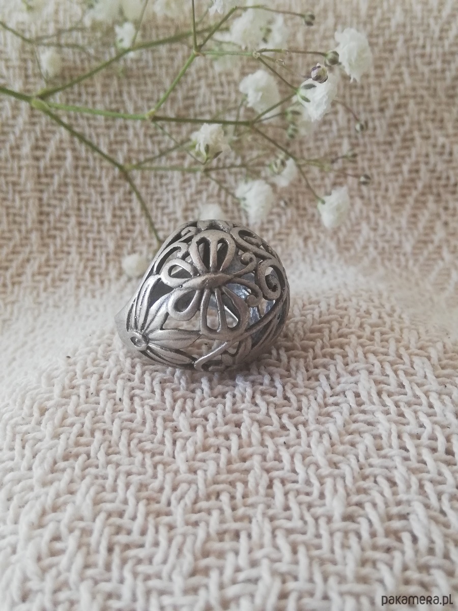 Posrebrzany pierścień w formie ażurowej kopuły przedstawiający kwiaty i motyla. Pomimo swych rozmiarów jest bardzo wygodny w noszeniu dzięki swym opływowym kształtom. Wykonany został z mosiądzu a w ostatniej fazie pokryty srebrem. Jedyny taki nietuzinkowy pierścień, w którym zostało zaklęte piękno botanicznego świata.