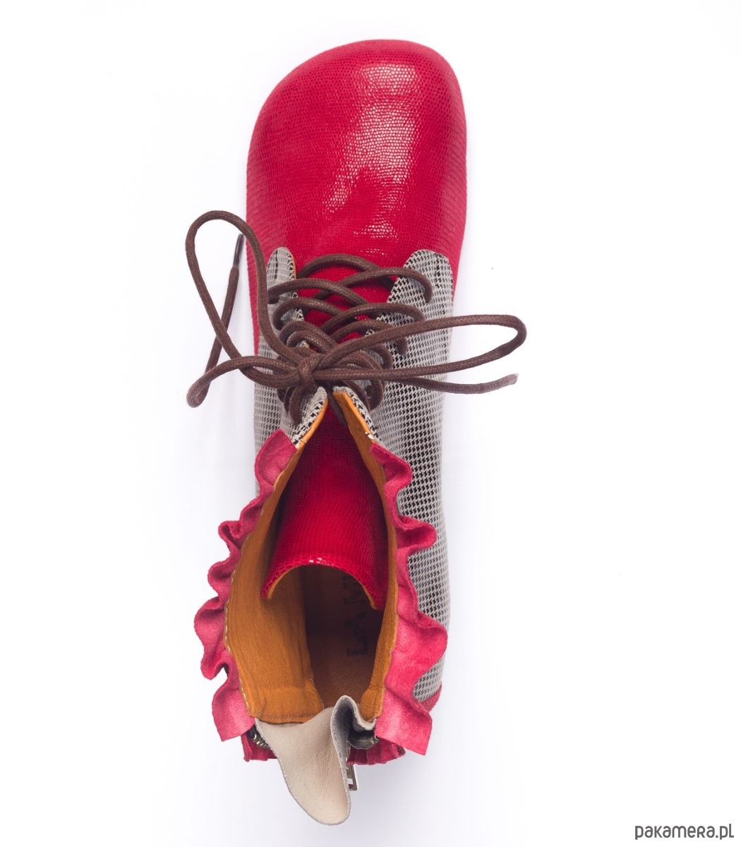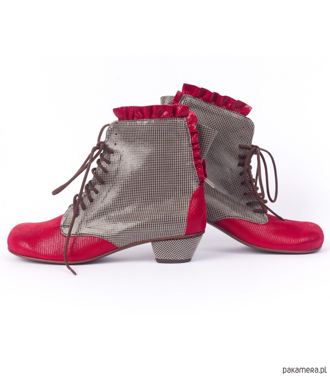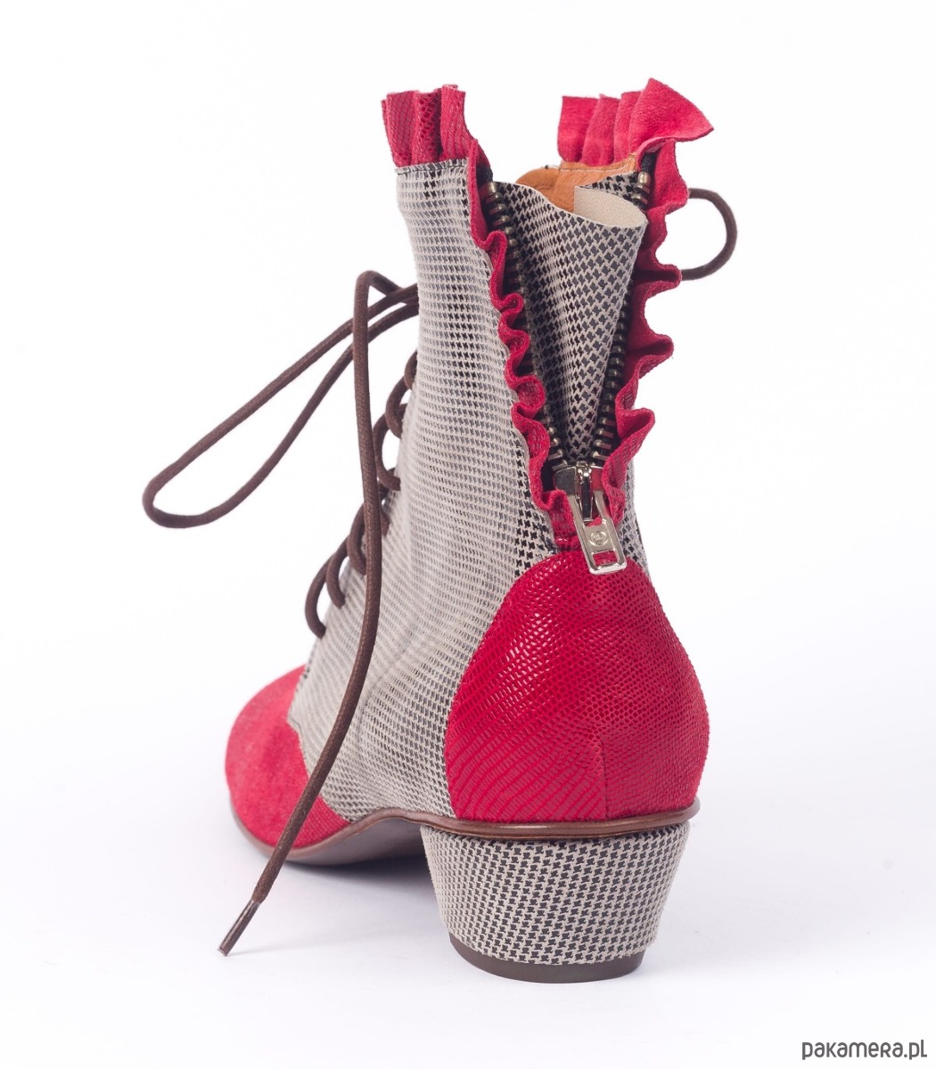 Delikatnie kwadratowy nosek optycznie zmniejsza stopę, a obcas o wysokości 3,5 cm subtelnie wydłuża sylwetkę, nadając jej lekkości. Cholewka ma około 15 cm wysokości (w zależności od rozmiaru, bez obcasa), delikatnie otulając kostkę i zapewniając wygodne, eleganckie dopasowanie.