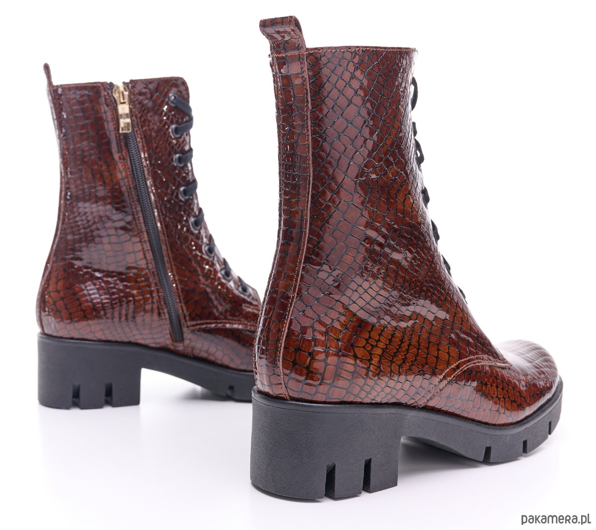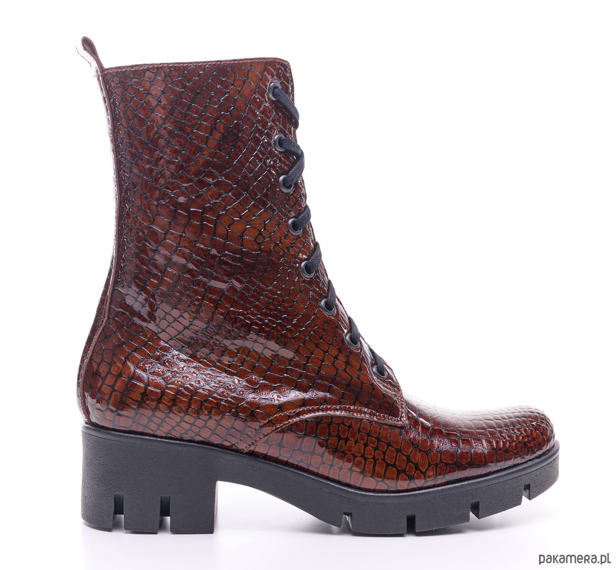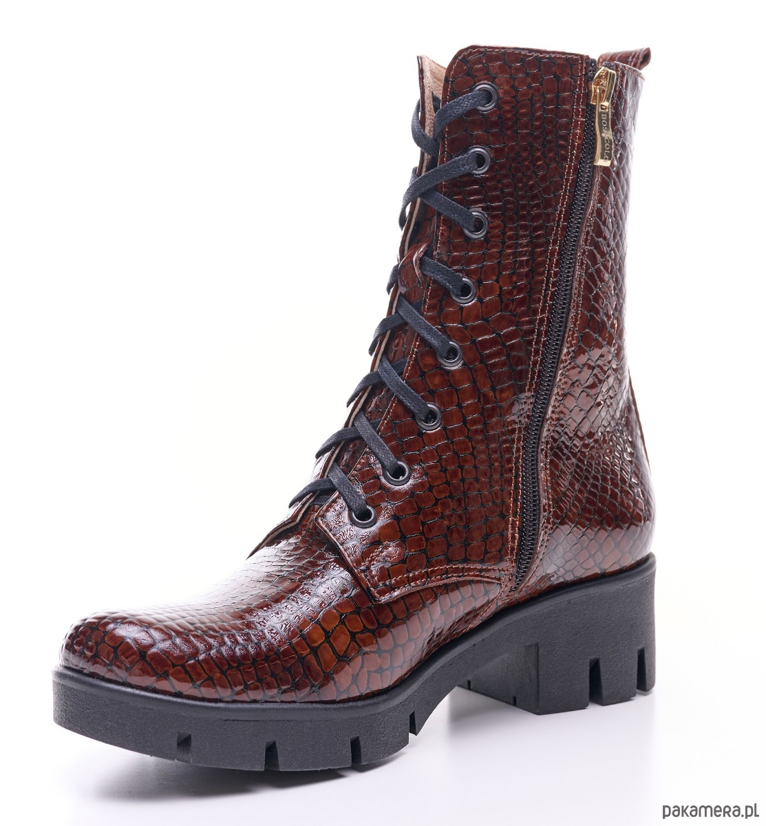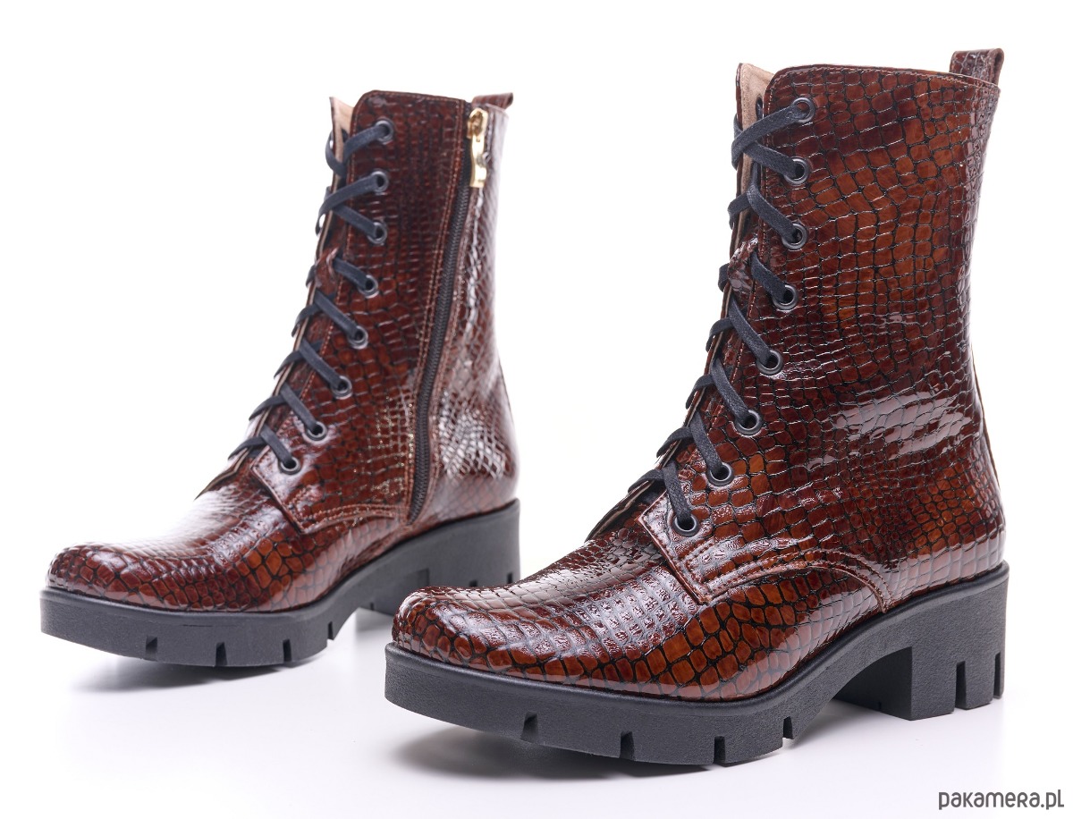 Eleganckie botki skórzane z naturalnej skóry, lakierowanej, faktura krokodyla.