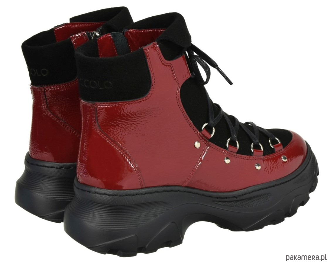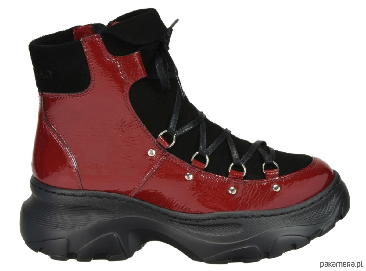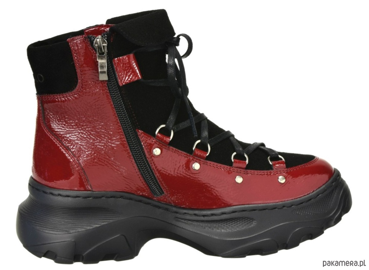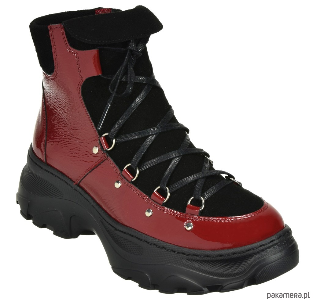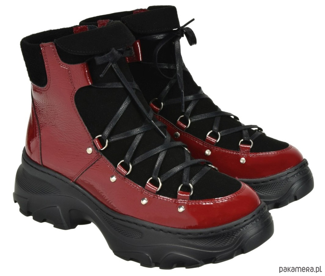 Botki skórzane - suwak i sznurówki - czerwono czarne (6214)