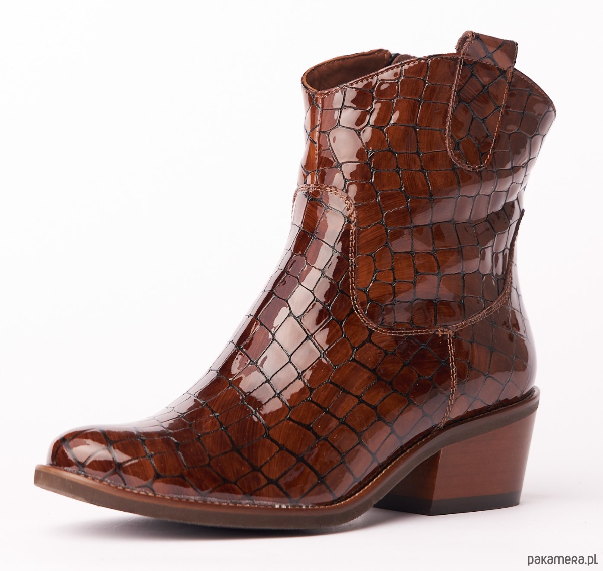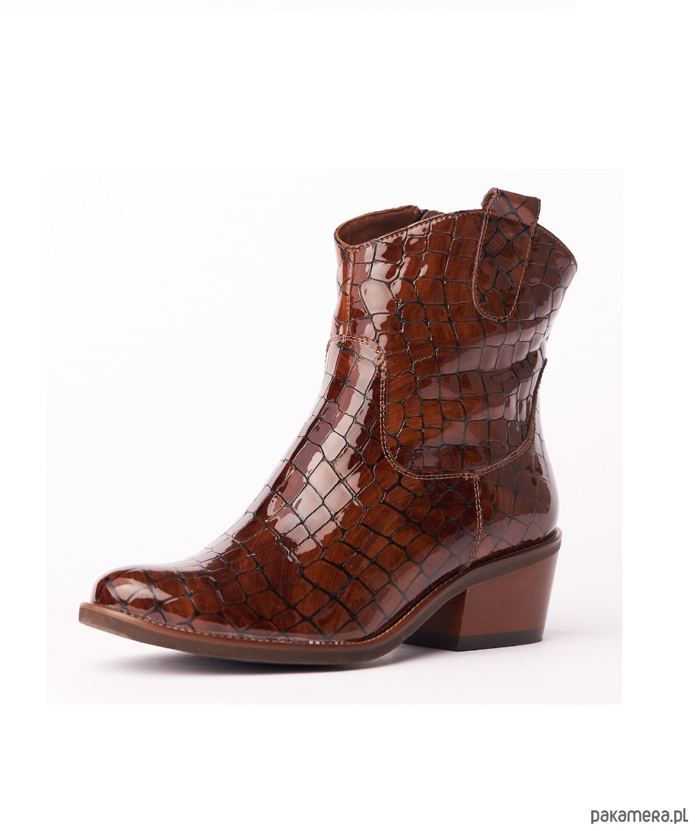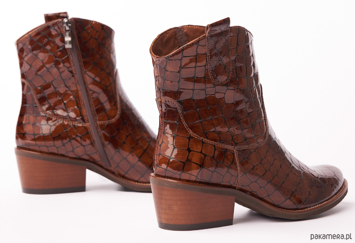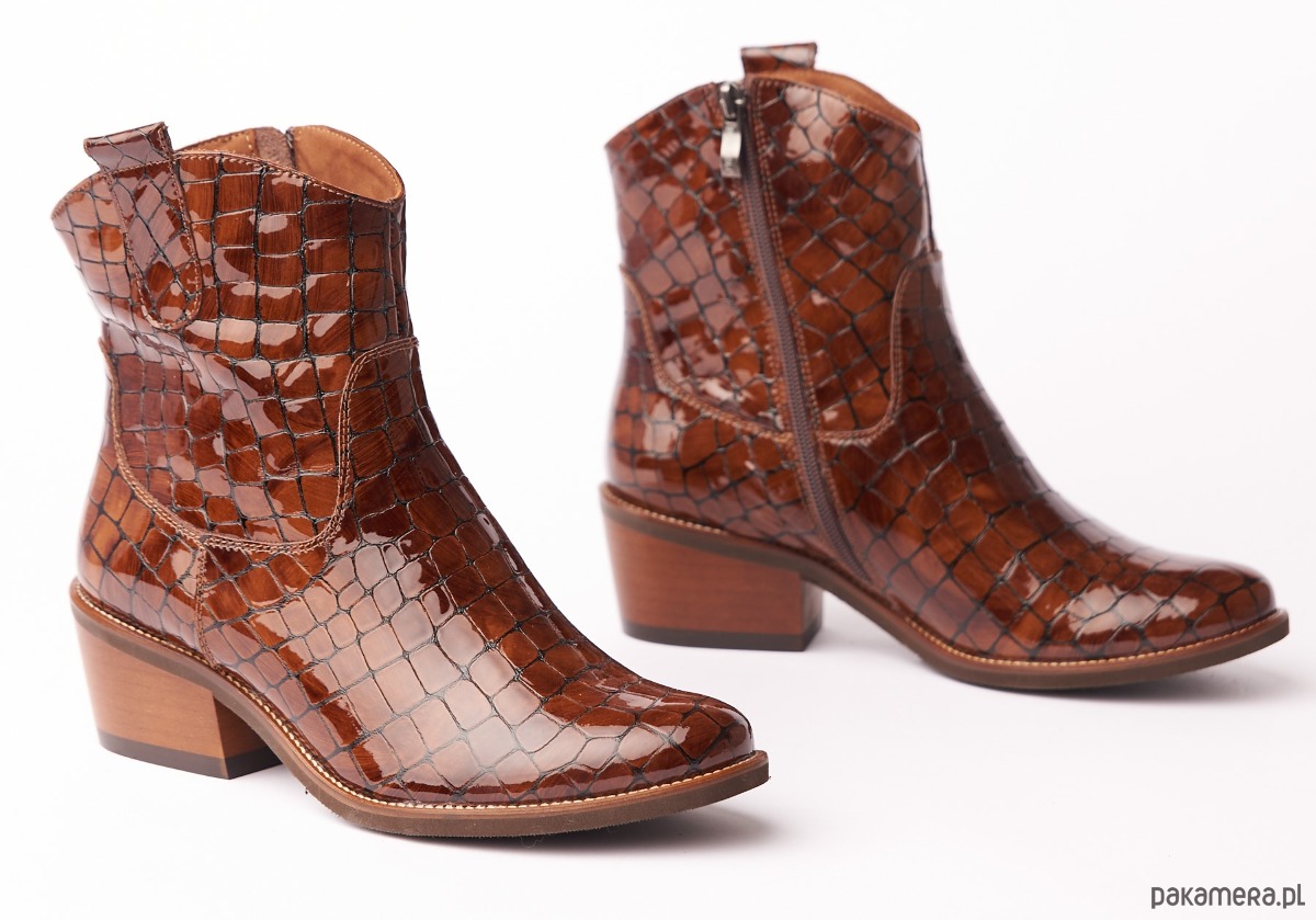 Eleganckie botki skórzane z naturalnej skóry lakierowanej o fakturze skóry krokodyla.