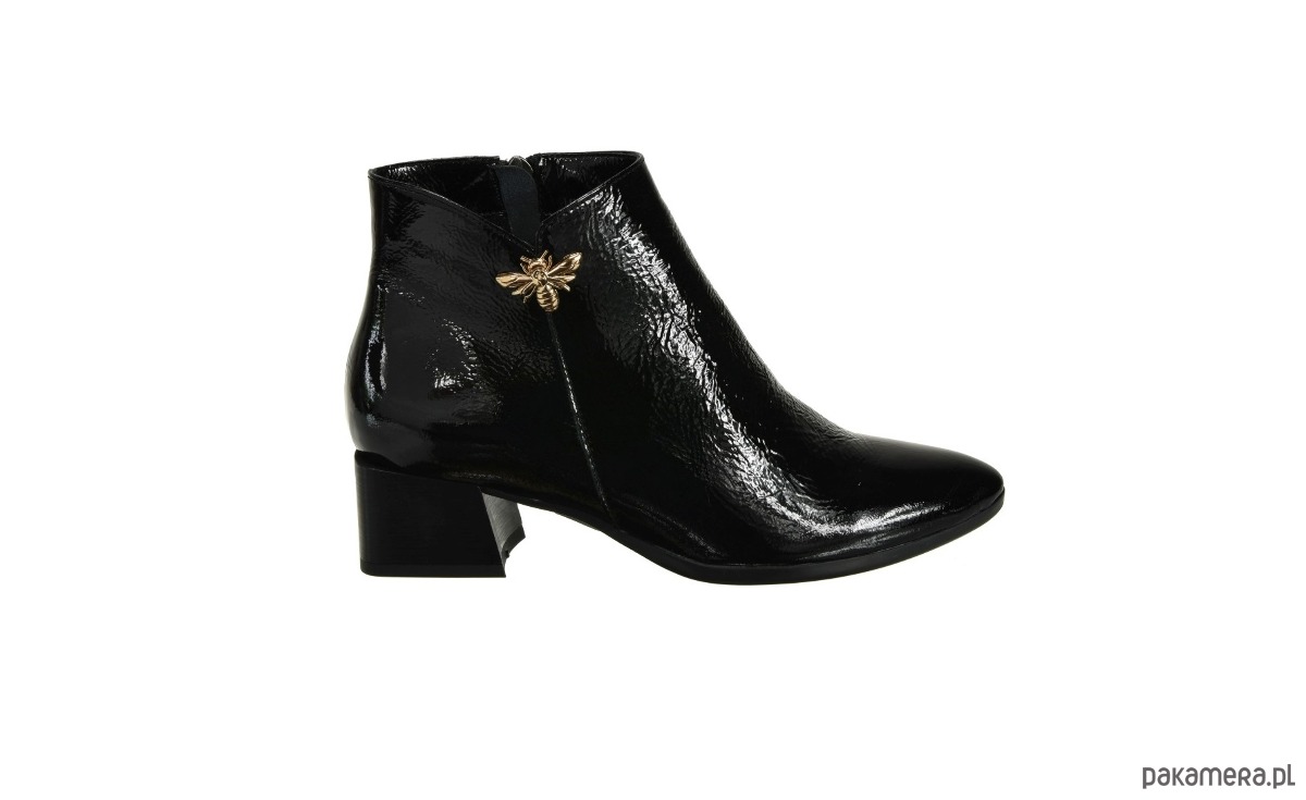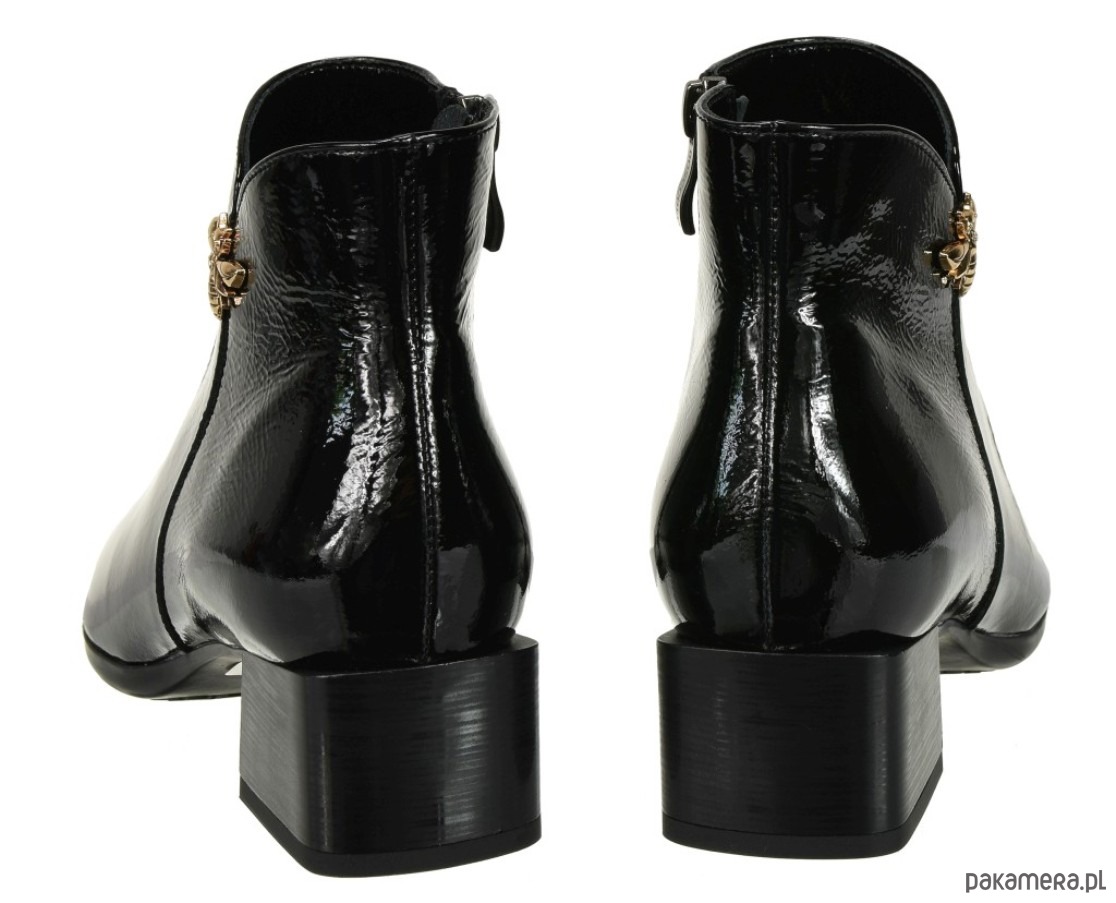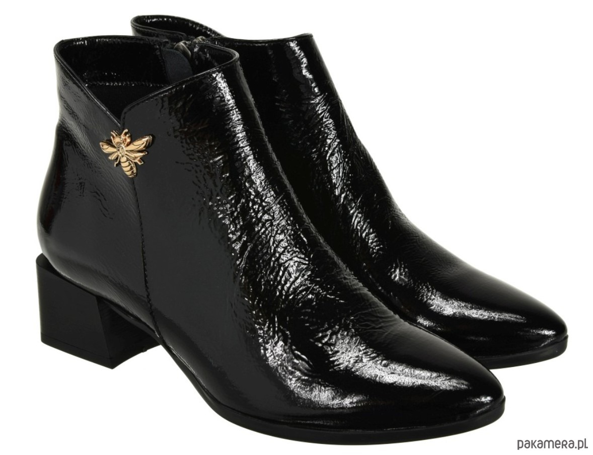 Nowoczesne botki damskie wykonane ze skóry naturalnej, lakierowanej, zmięty wygląd .