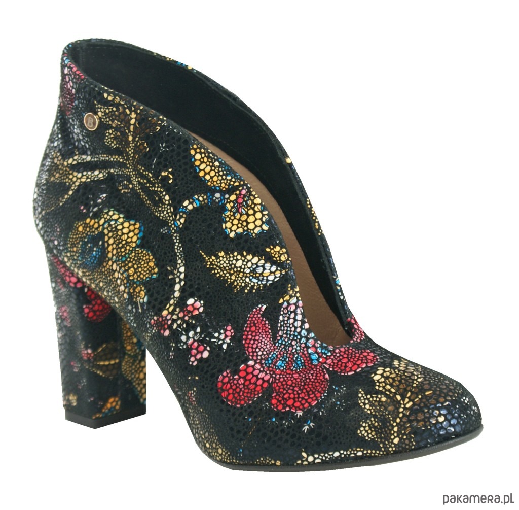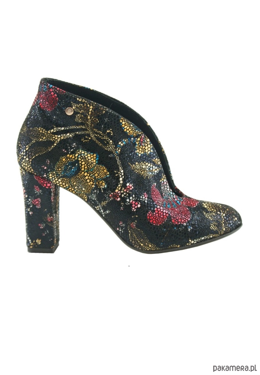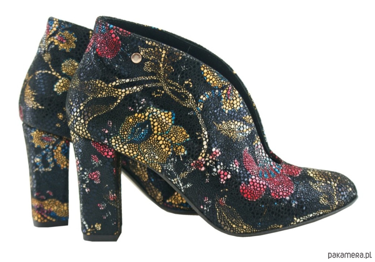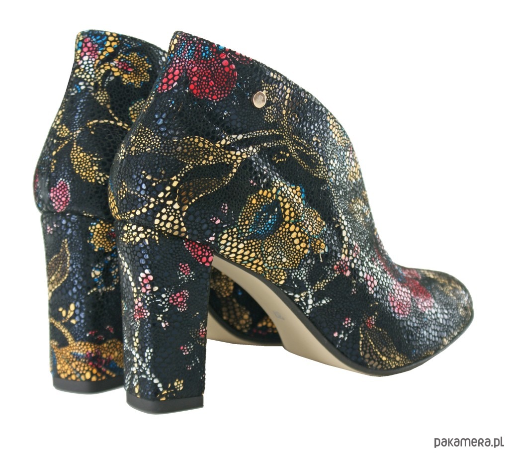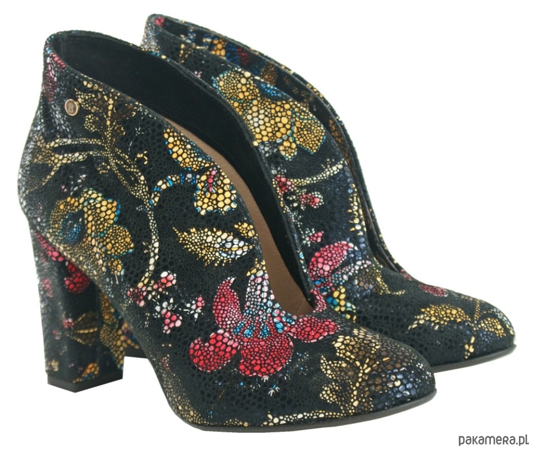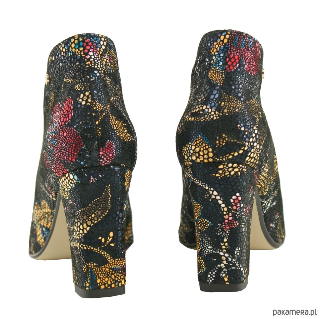 Skórzane botki na obcasie ze skóry naturalnej w ozdobne wzory, wsuwane.