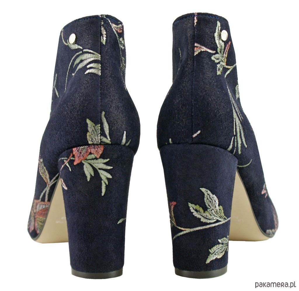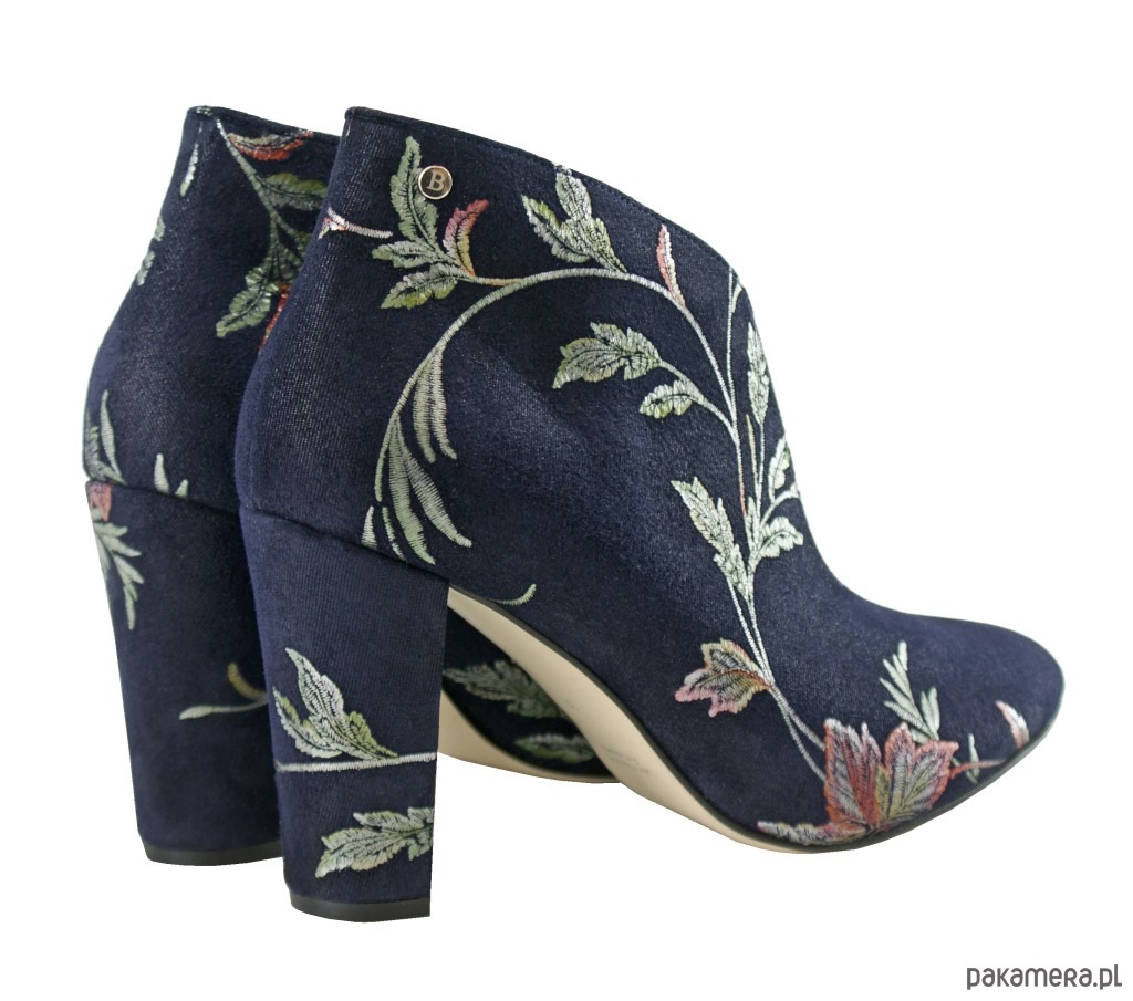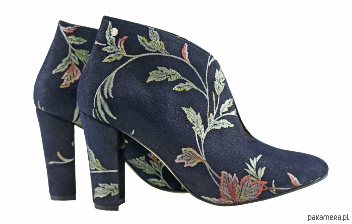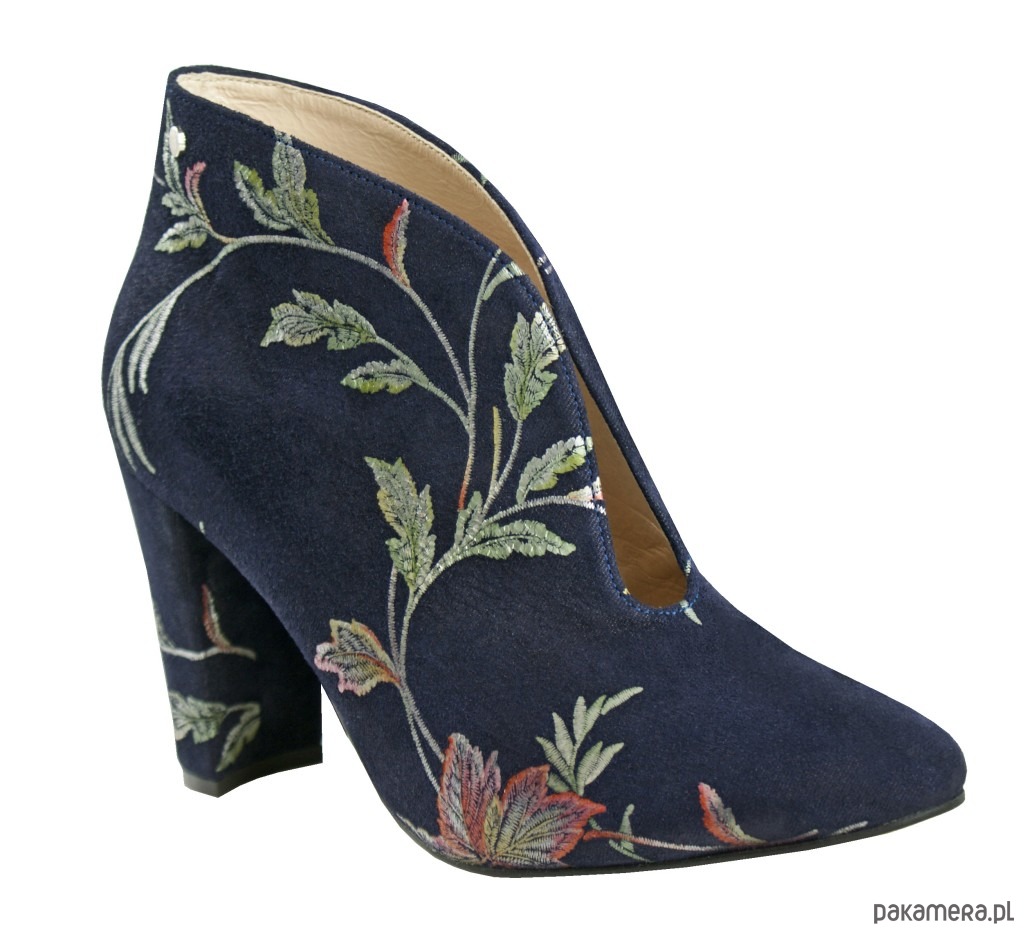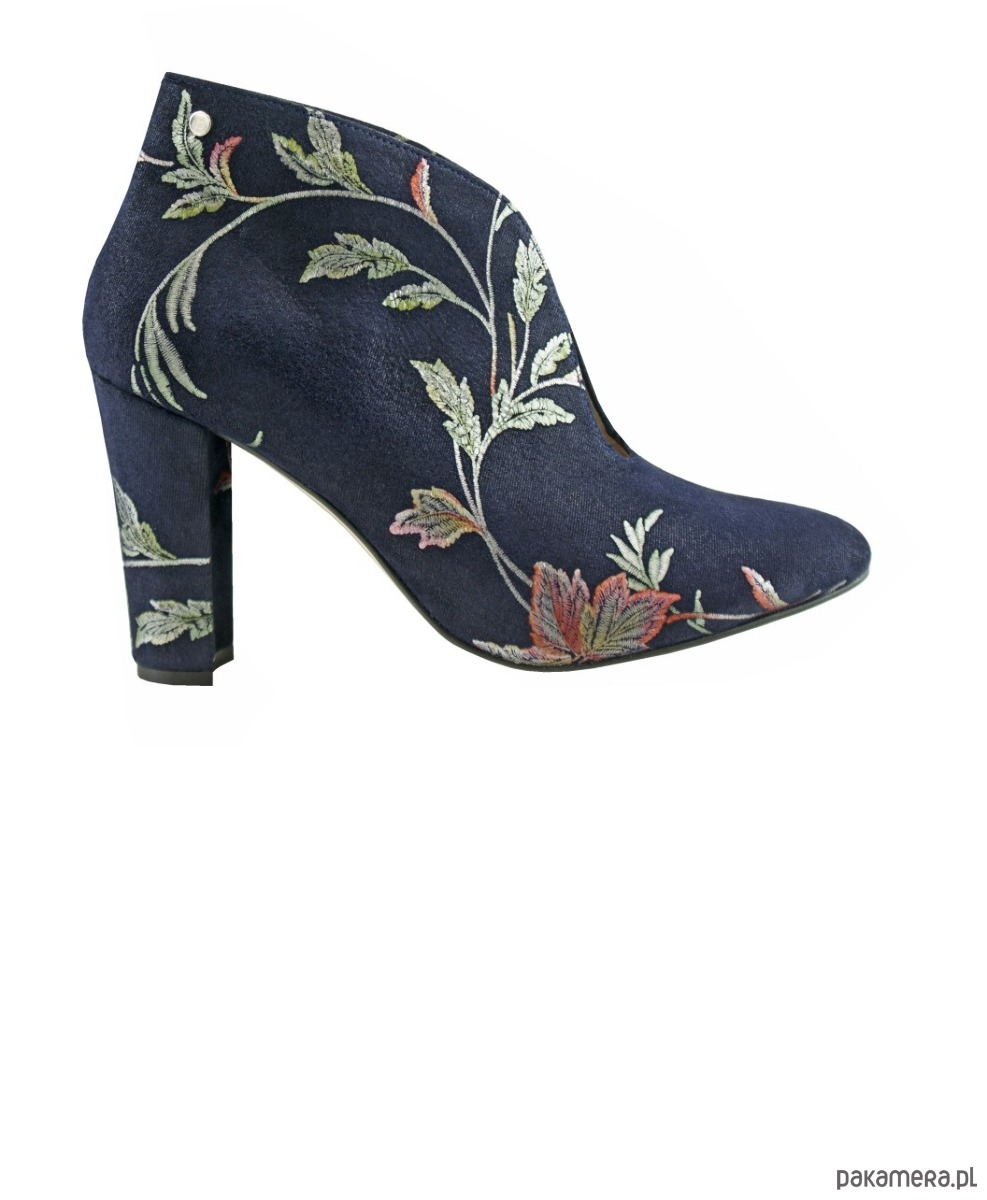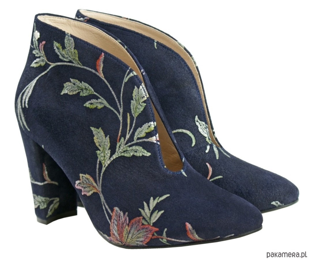 Skórzane botki na obcasie, ze zamszowej skóry naturalnej, ozdobny haft, wsuwane.