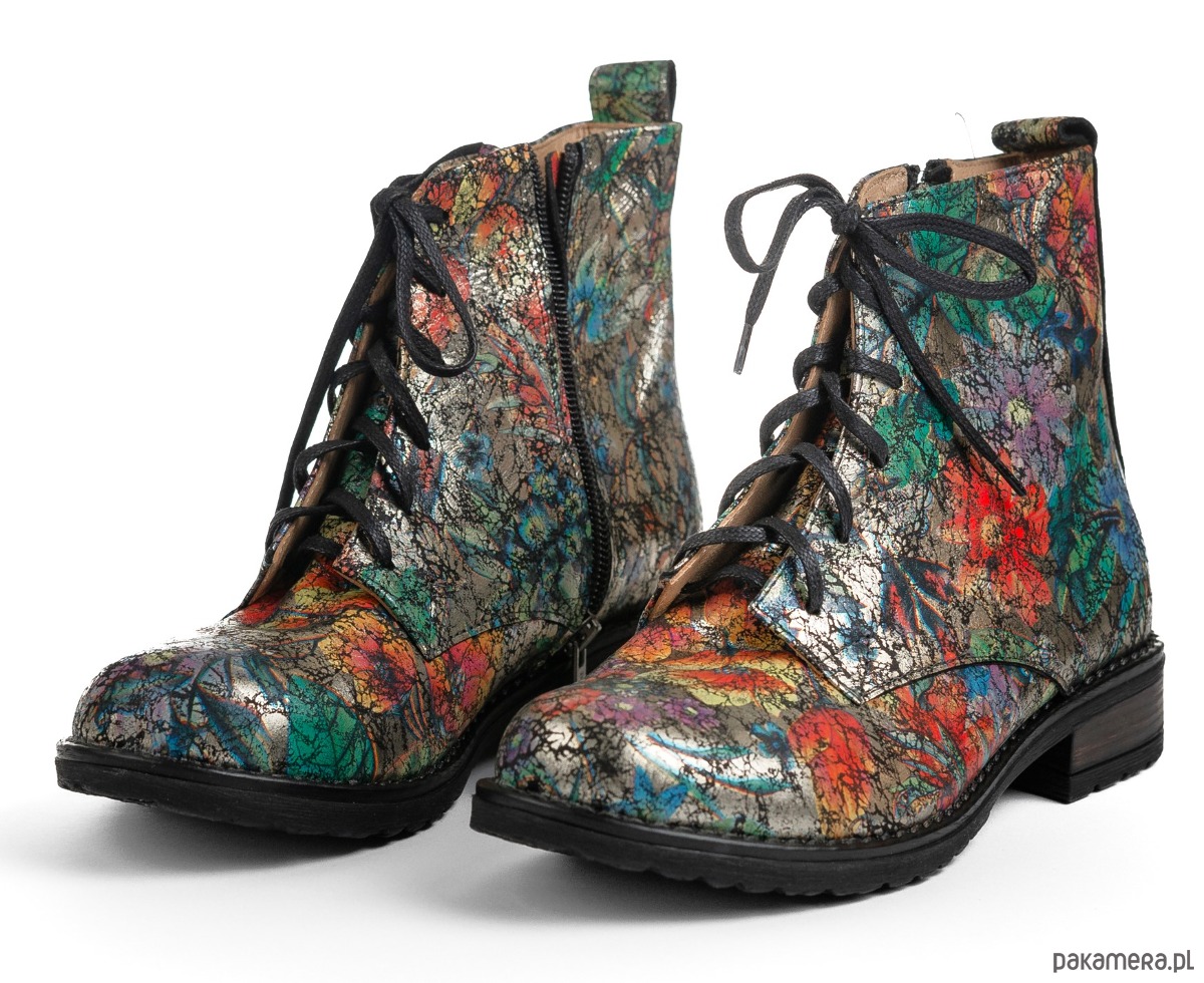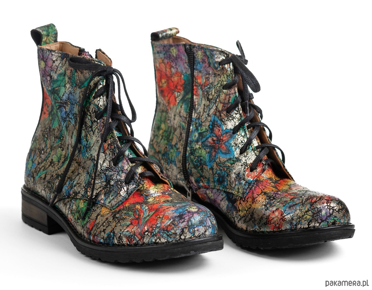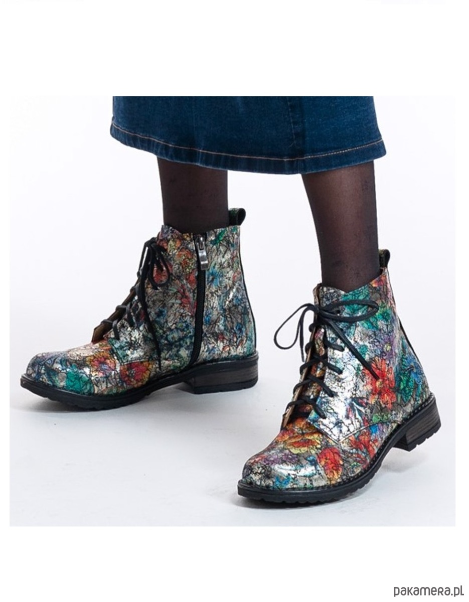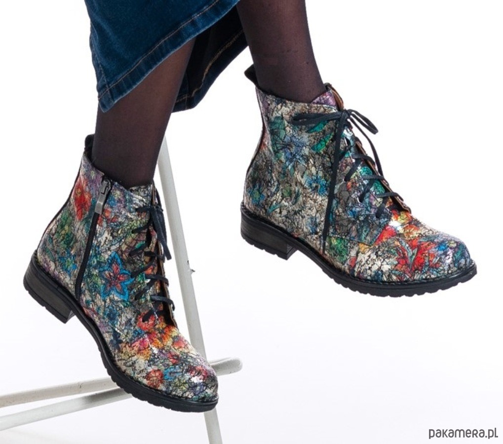 Botki skórzane - wzór w kolorowe kwiaty (7190)