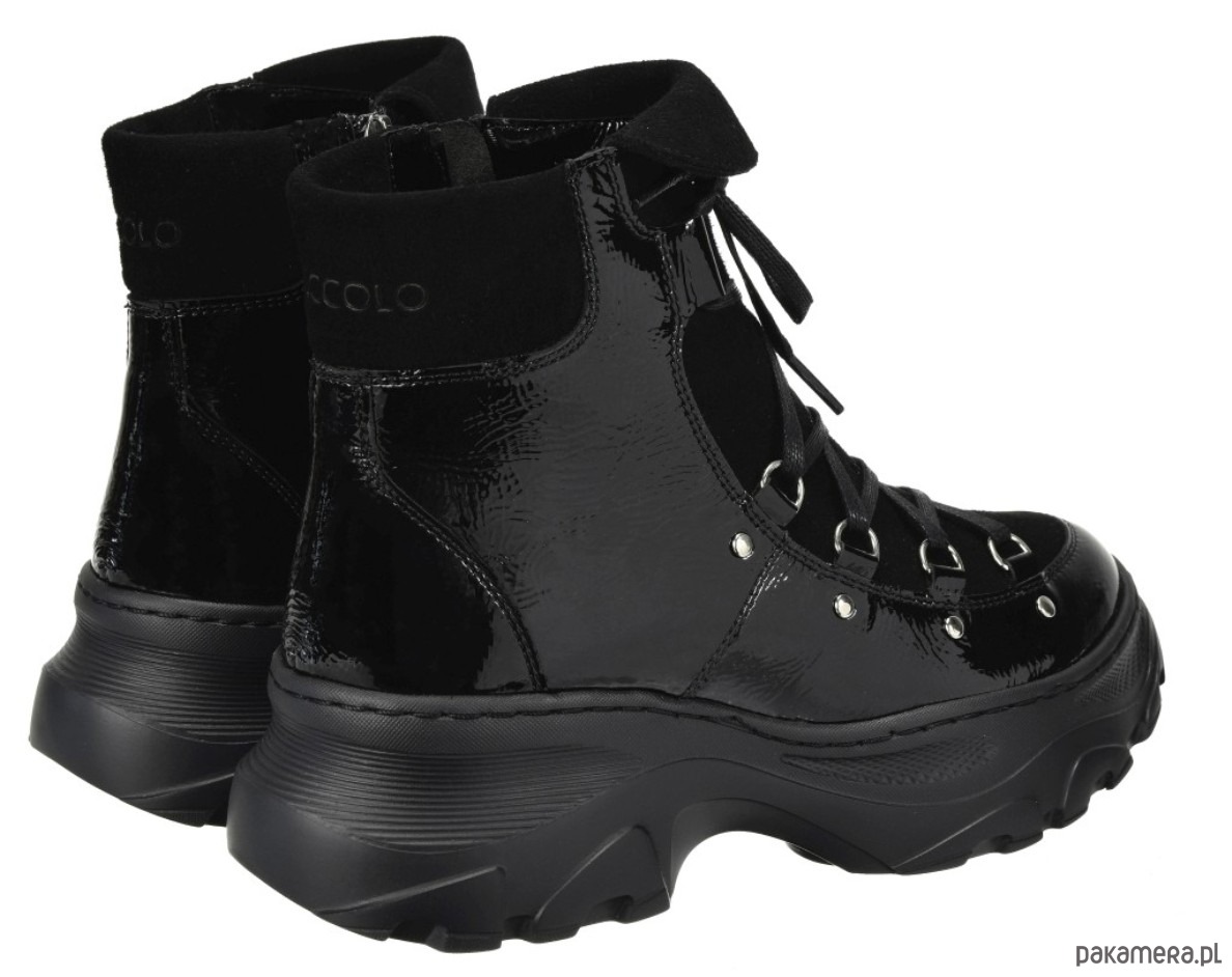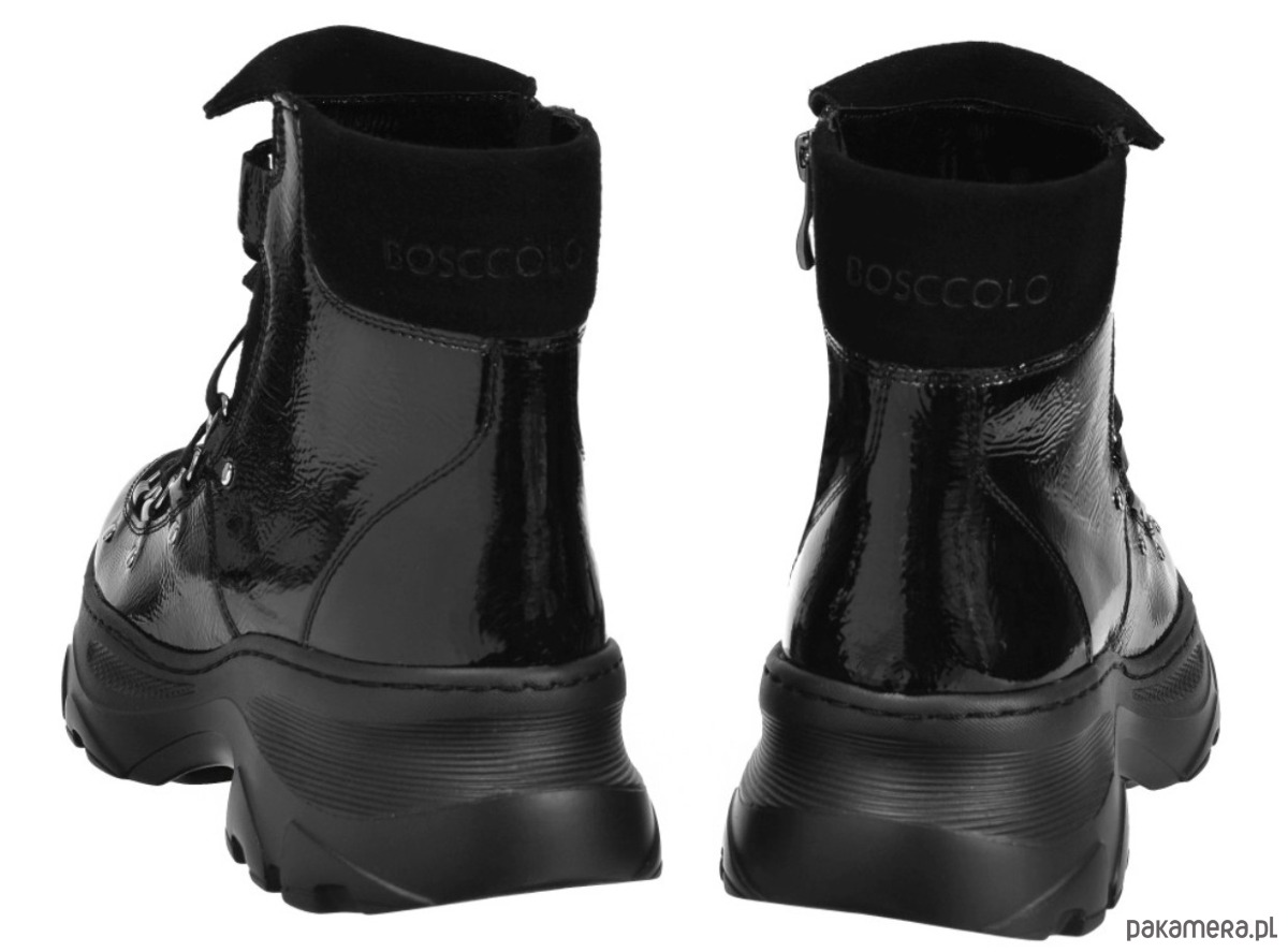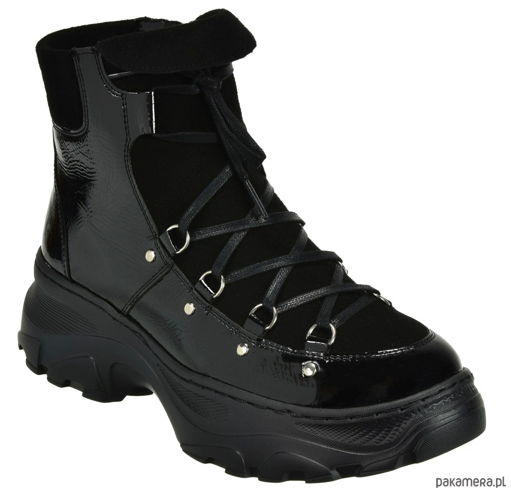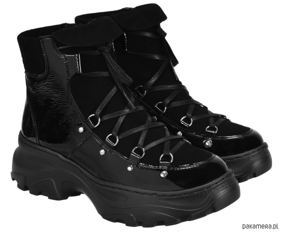 Nowoczesne botki damskie wykonane ze skóry naturalnej, lakierowanej i nubuku.