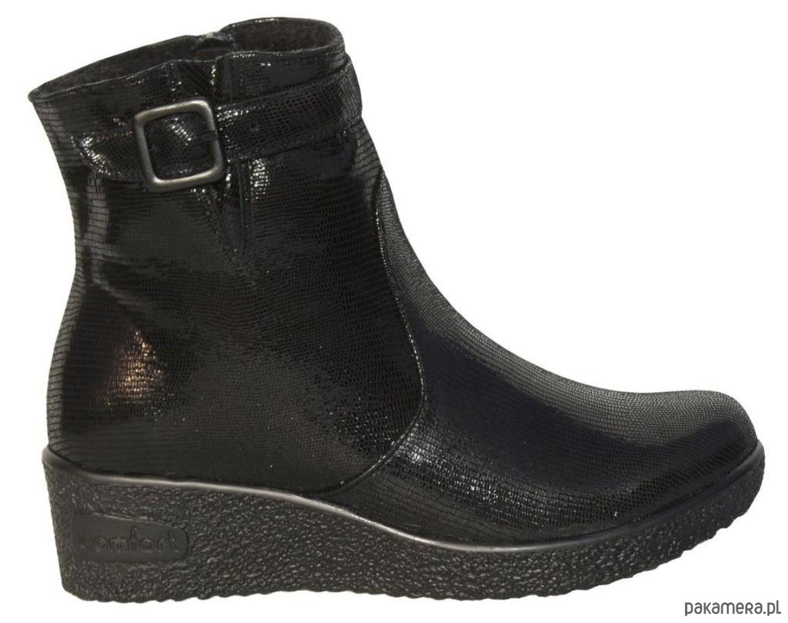 Botki skórzane z naturalnej skóry o fakturze "żmijki", na grubej podeszwie typu "comfort" dającej dobrą izolację od podłoża.
