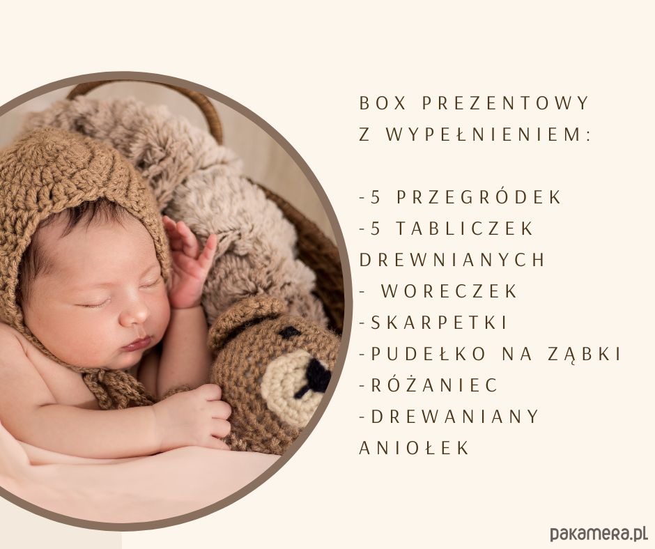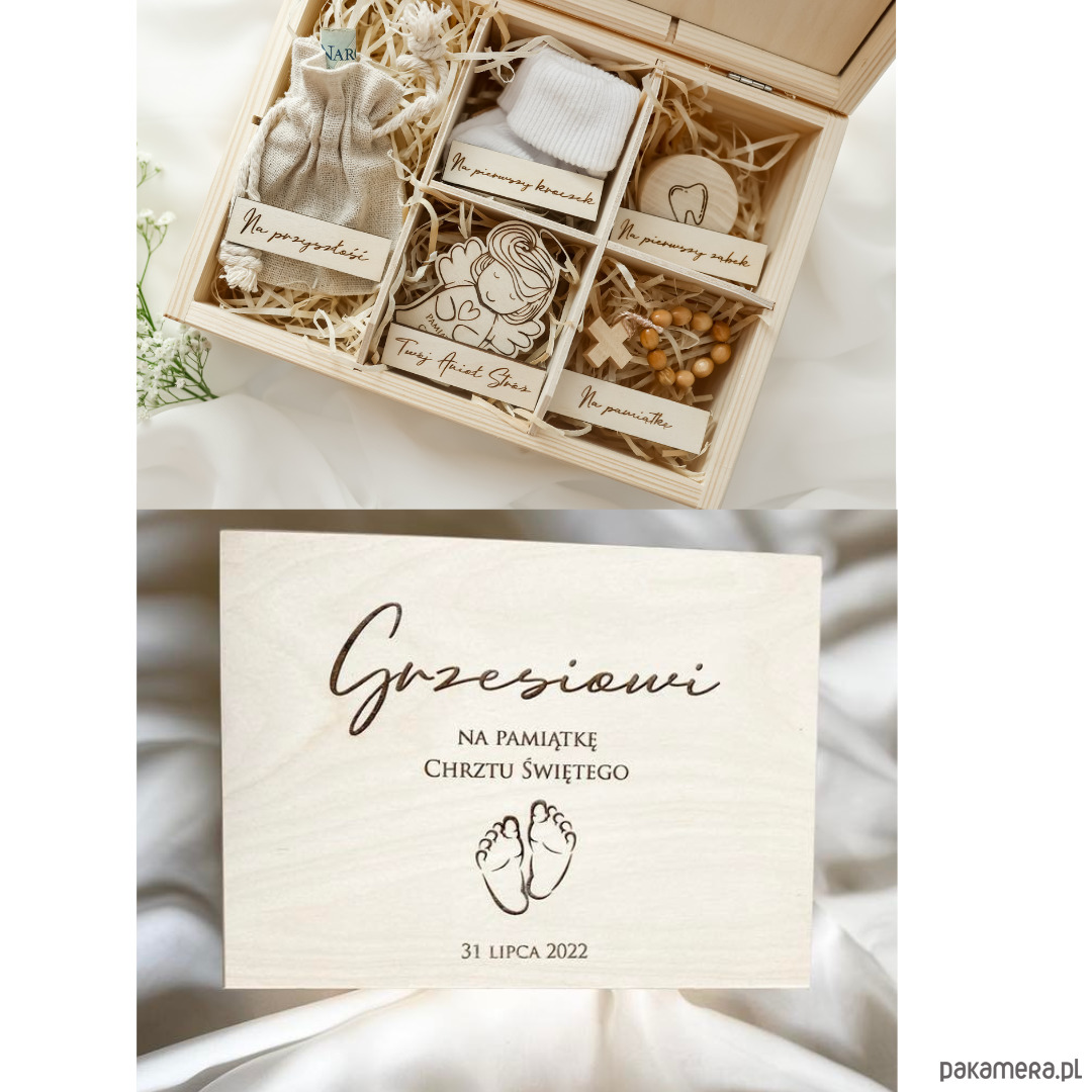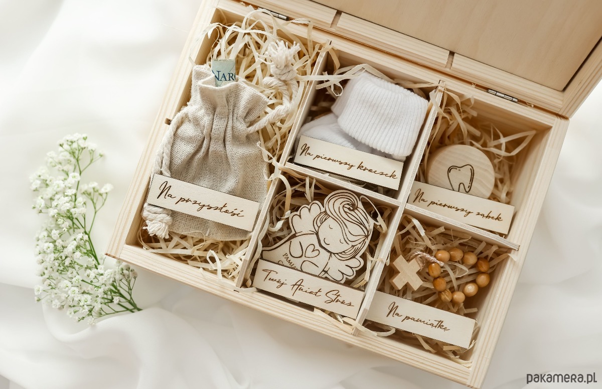 Drewniany box to wyjątkowy prezent dla Maluszka na Chrzest Święty.