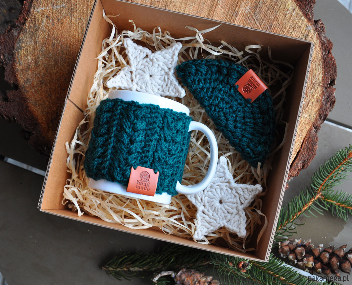 Box prezentwowy, kubek w sweterku, podkładka, gwiazdki