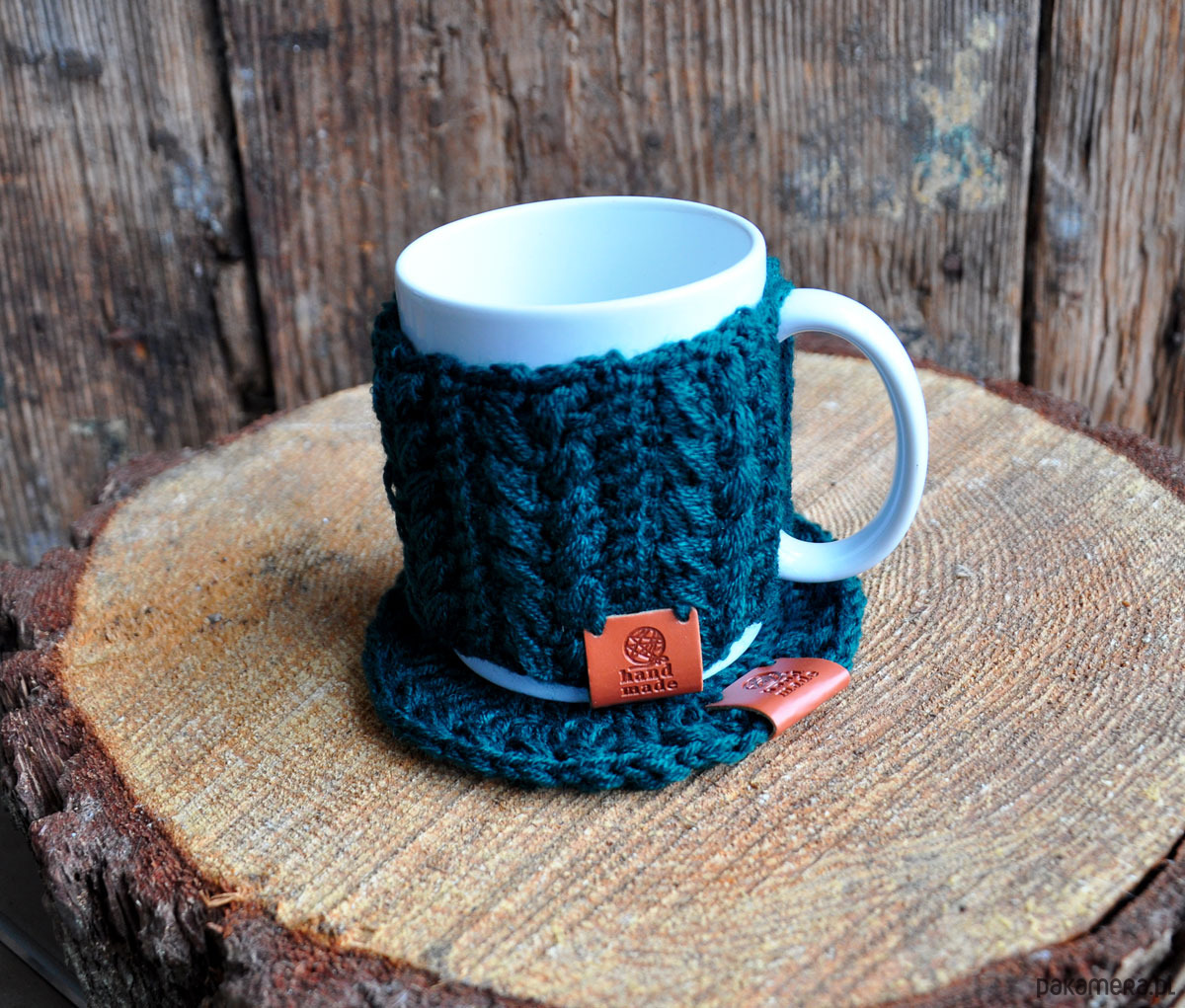 - kubek (biały, bez nadruku) w szydełkowym sweterku w warkocze, które można zdejmować,